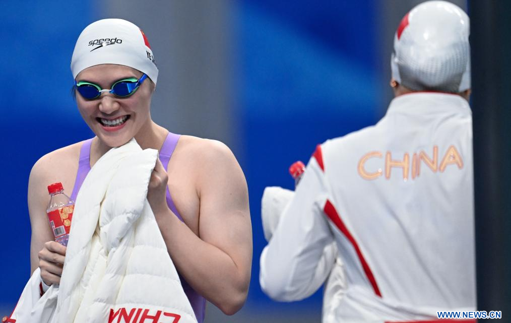 HANGZHOU, 26 septembre (Xinhua) -- La Chinoise Ye Shiwen (à gauche) avant la finale du 200m quatre nages individuel féminin aux 19es Jeux asiatiques, à Hangzhou, dans la province chinoise du Zhejiang (est), le 25 septembre 2023. (Photo : Xia Yifang)