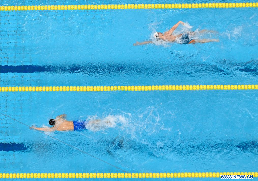 HANGZHOU, 26 septembre (Xinhua) -- Le Chinois Wang Haoyu (en haut) participe à la finale du relais 4x200 libre masculin de natation aux 19es Jeux asiatiques, à Hangzhou, dans la province chinoise du Zhejiang (est), le 25 septembre 2023. (Photo : Xia Yifang)