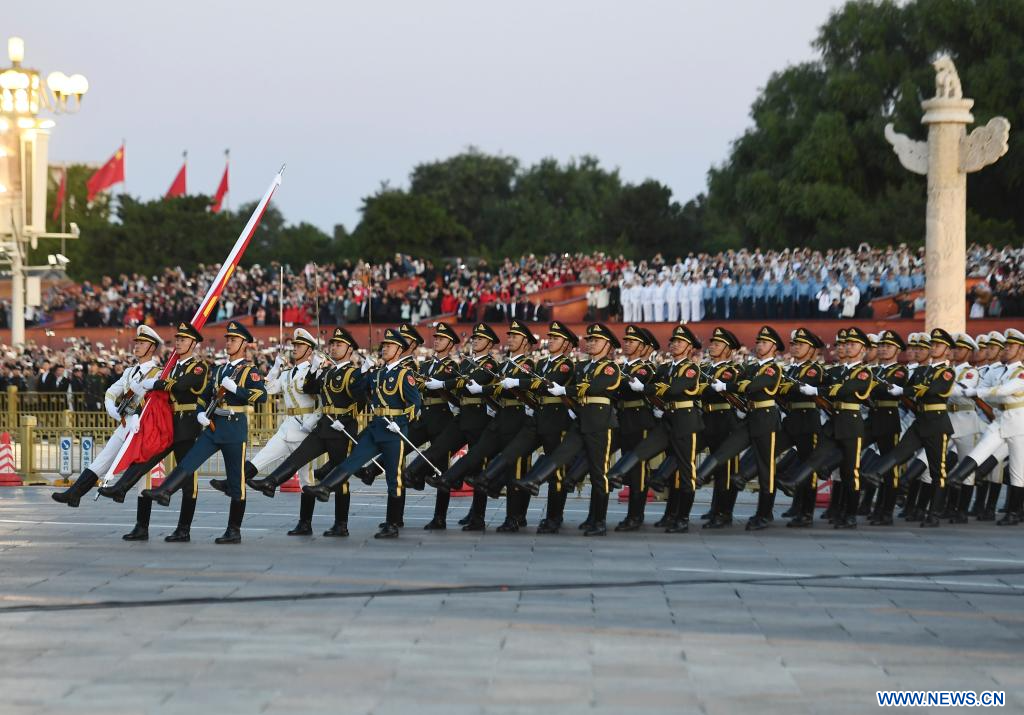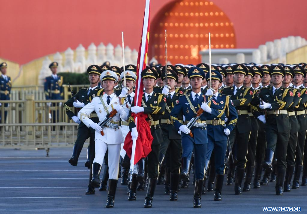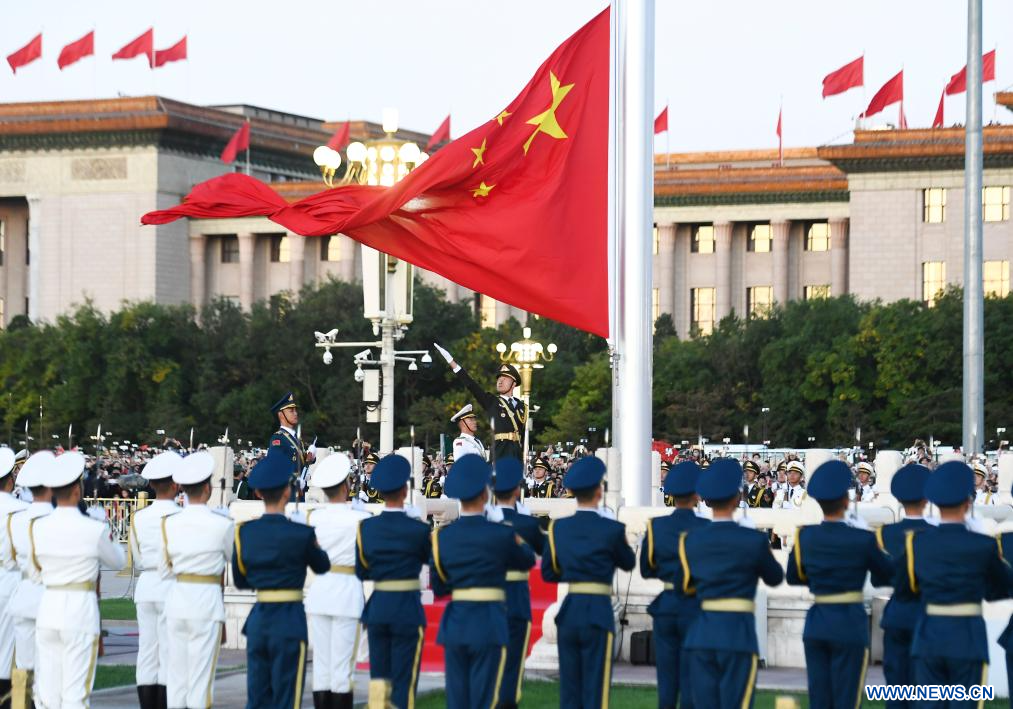 BEIJING, 1er octobre (Xinhua) -- Une cérémonie de lever du drapeau national se déroulant sur la place Tian'anmen, à Beijing, capitale chinoise, le 1er octobre 2023, pour célébrer le 74e anniversaire de la fondation de la République populaire de Chine. (Photo : Ju Huanzong)