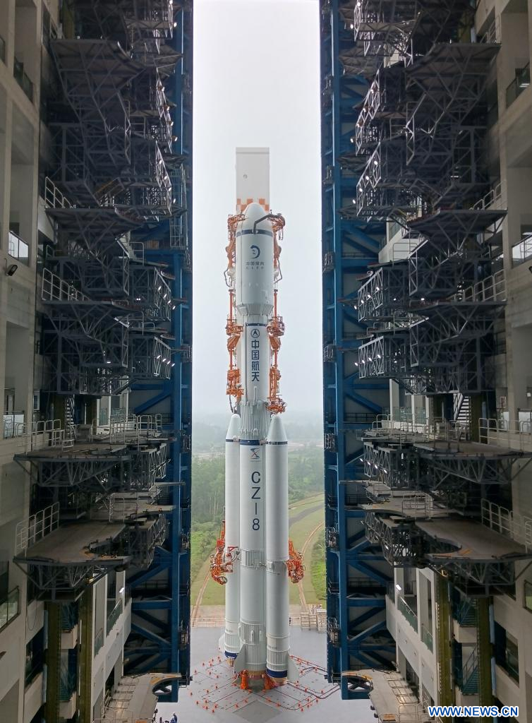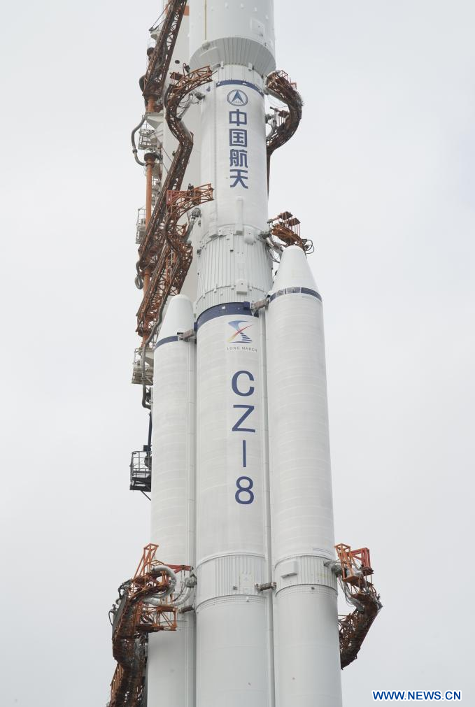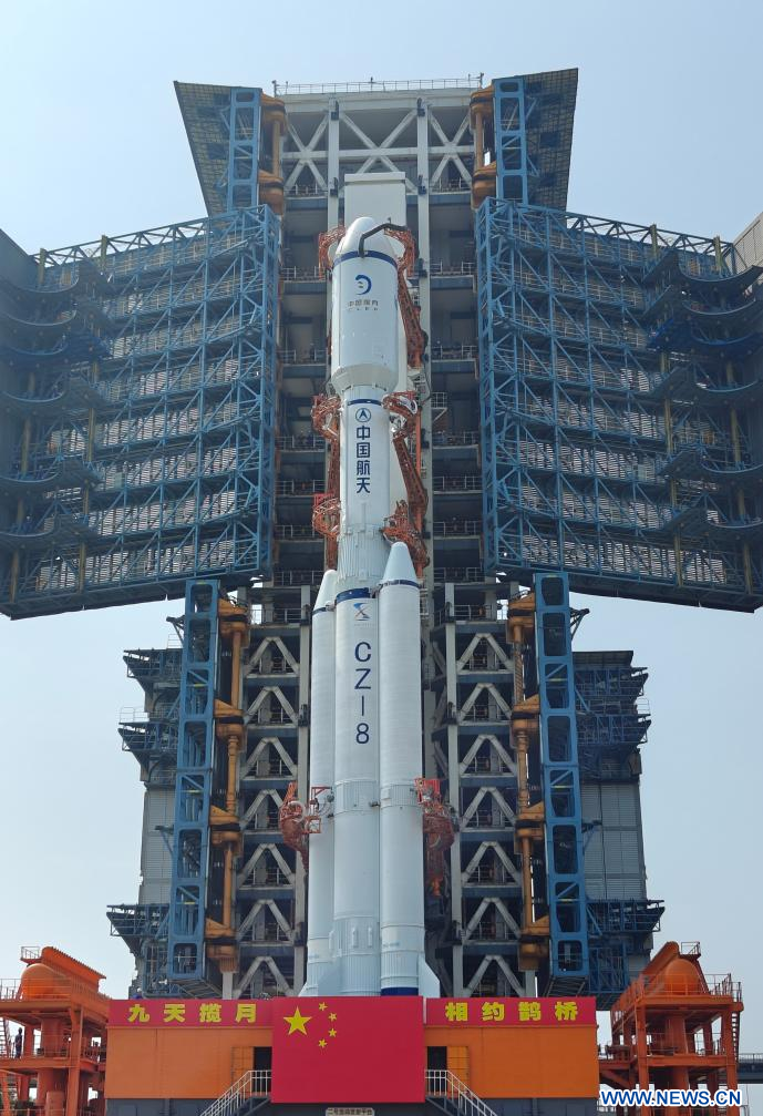 WENCHANG, Hainan, 17 mars (Xinhua) -- La combinaison du satellite relais Queqiao-2 et de la fusée porteuse Longue Marche-8 Y3 a été transférée verticalement dimanche vers la zone de lancement du Centre de lancement spatial de Wenchang, dans la province chinoise de Hainan (sud).