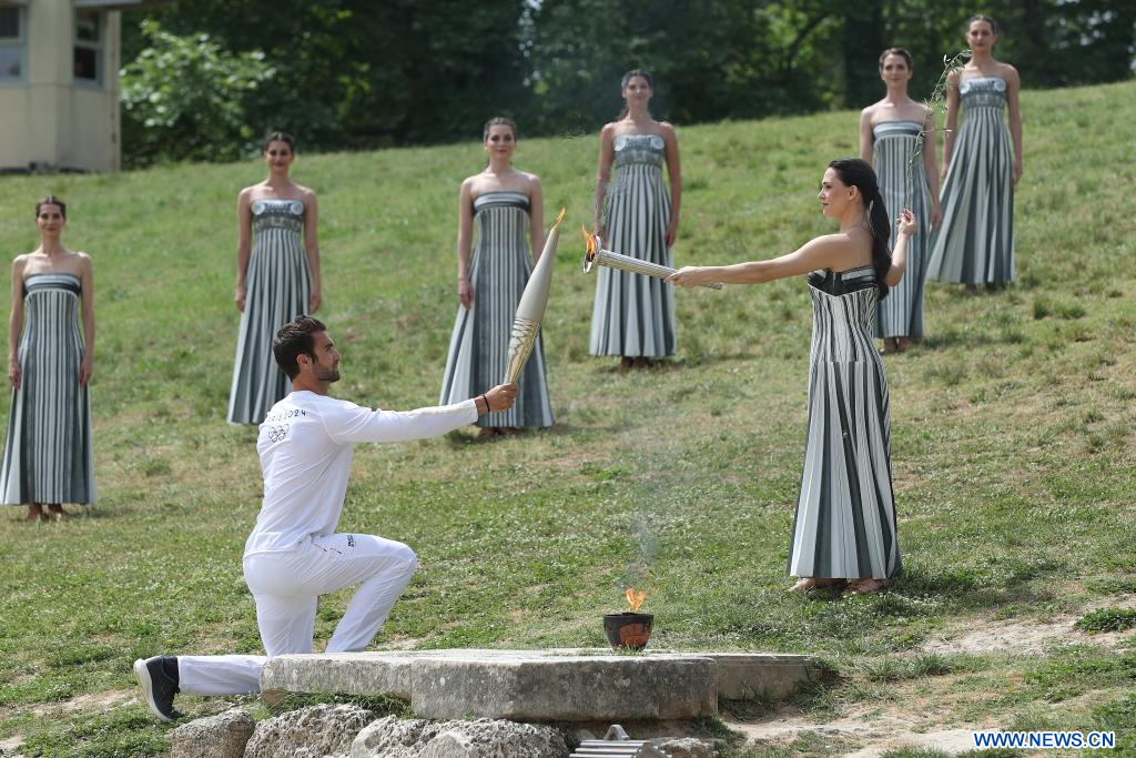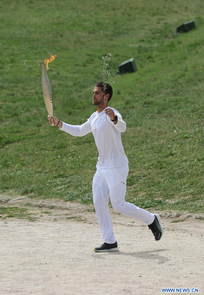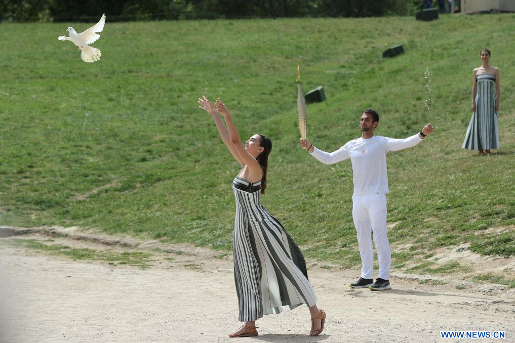 Après un spectacle de danse inspiré par les statues de la Grèce antique sur la pente du stade, la grande prêtresse a allumé la première torche olympique des Jeux et l'a transmise au premier relayeur, l'athlète grec Stefanos Ntouskos, médaillé d'or d'aviron, accompagnée d'un rameau d'olivier.