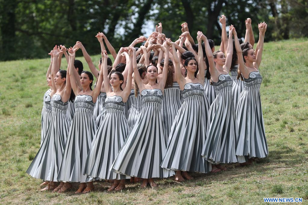 Escortée par des dizaines de danseurs et danseuses jouant le rôle de prêtresses et de jeunes hommes en costumes plissés, la flamme a été transportée dans une réplique d'urne antique jusqu'au stade où sont nés les Jeux olympiques, au rythme d'une lyre grecque antique et de percussions.