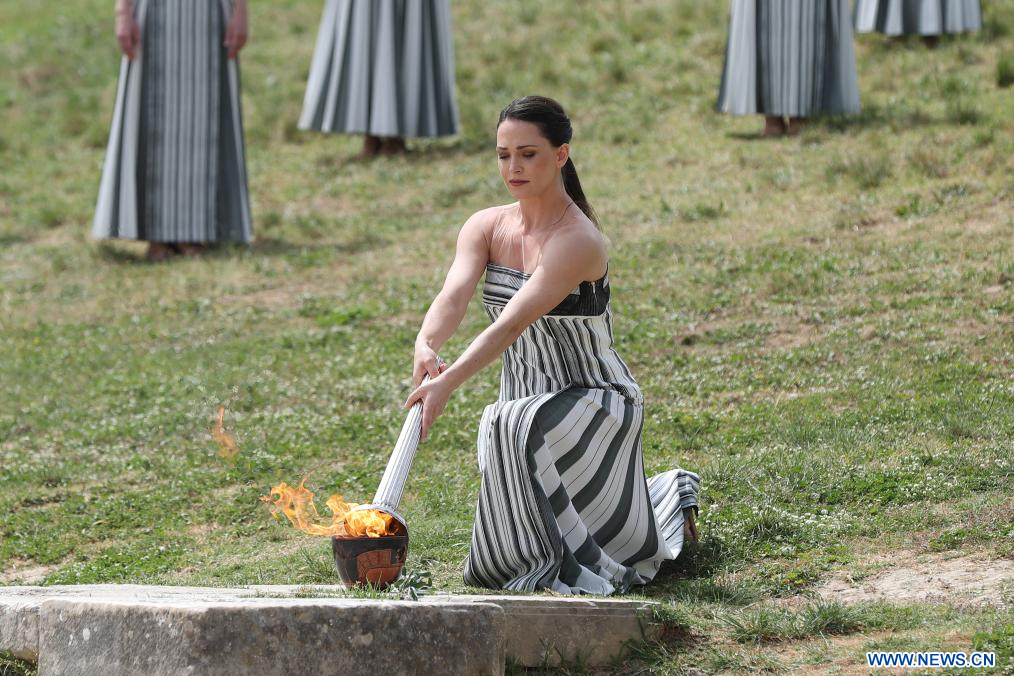 L'actrice Mary Mina, dans le rôle d'une grande prêtresse de la Grèce antique, a allumé la flamme à l'aide d'une flamme de réserve au lieu d'un miroir parabolique en raison d'un ciel nuageux devant le temple d'Héra, une déesse de la mythologie grecque antique.