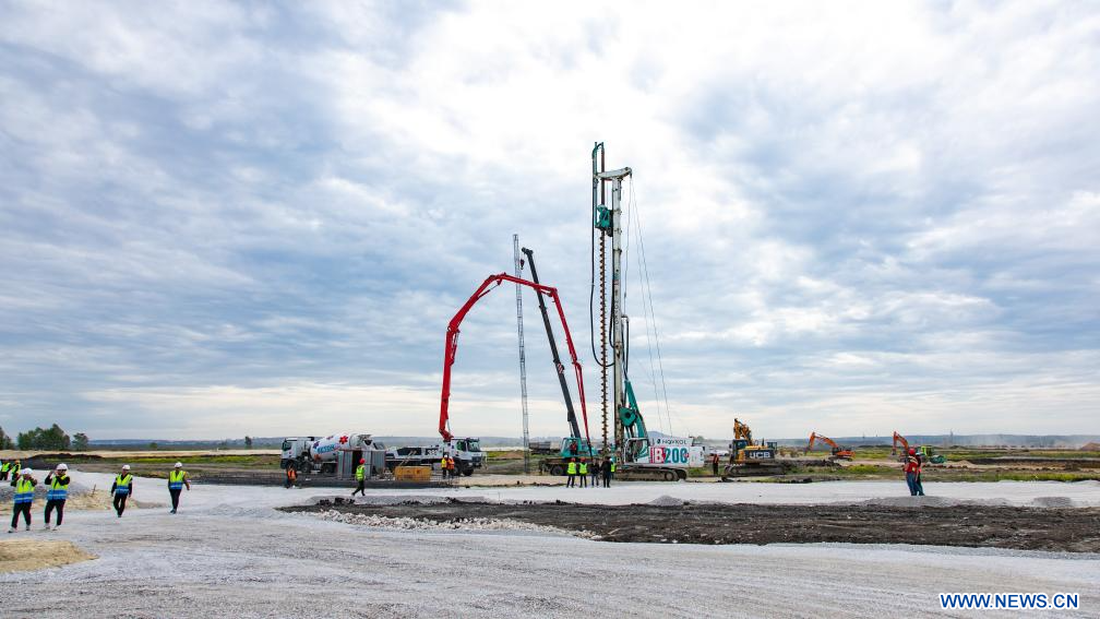 Photo prise le 1er mai 2024 montrant le site de construction du Stade national de Serbie à Belgrade, en Serbie. Une cérémonie de début de construction du Stade national de Serbie par la Power Construction Corporation of China (PowerChina) s'est tenue mercredi à Belgrade. (Xinhua/Wang Wei)