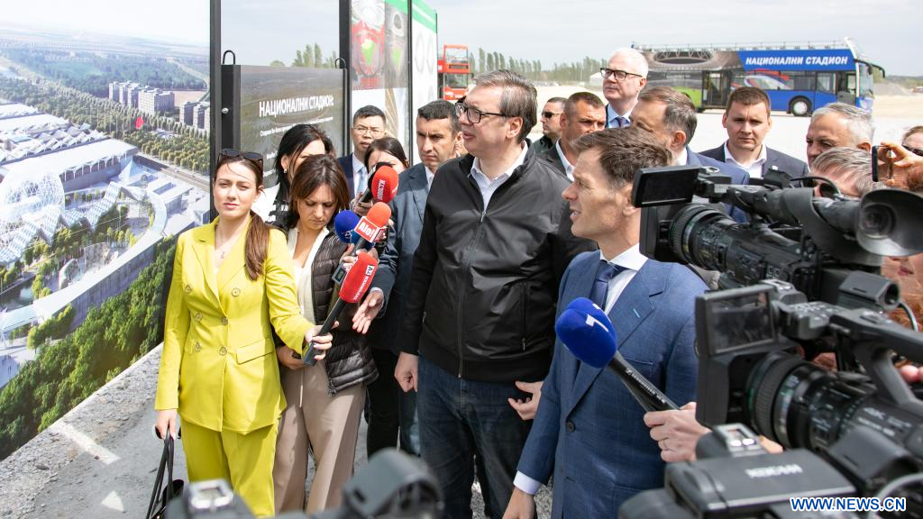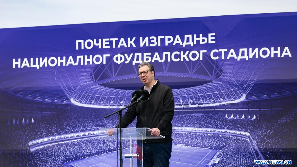 Le président serbe Aleksandar Vucic s'exprime lors de la cérémonie de début de construction du Stade national de Serbie à Belgrade, en Serbie, le 1er mai 2024. Cette cérémonie de début de construction du Stade national de Serbie par la Power Construction Corporation of China (PowerChina) s'est tenue mercredi à Belgrade. (Xinhua/Wang Wei)