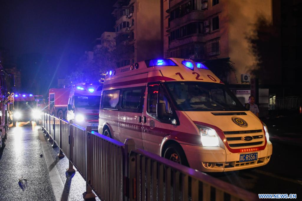 Photo d'ambulances sur le site de l'incendie survenu dans un grand magasin de la ville de Zigong, dans la province du Sichuan, dans le sud-ouest de la Chine, le 18 juillet 2024. L'opération de secours a été achevée jeudi à 03H00, selon le centre local de lutte contre les incendies et de secours. Au total, 16 personnes ont été tuées, et aucune personne ne reste prise au piège. L'incendie survenu dans l'immeuble de 14 étages, situé dans une zone de haute technologie de la ville, a été signalé mercredi vers 18H00, et une épaisse fumée se dégageait des lieux. Selon les premiers éléments de l'enquête, l'incendie a été provoqué par des travaux de construction. (Photo : Wang Xi)
