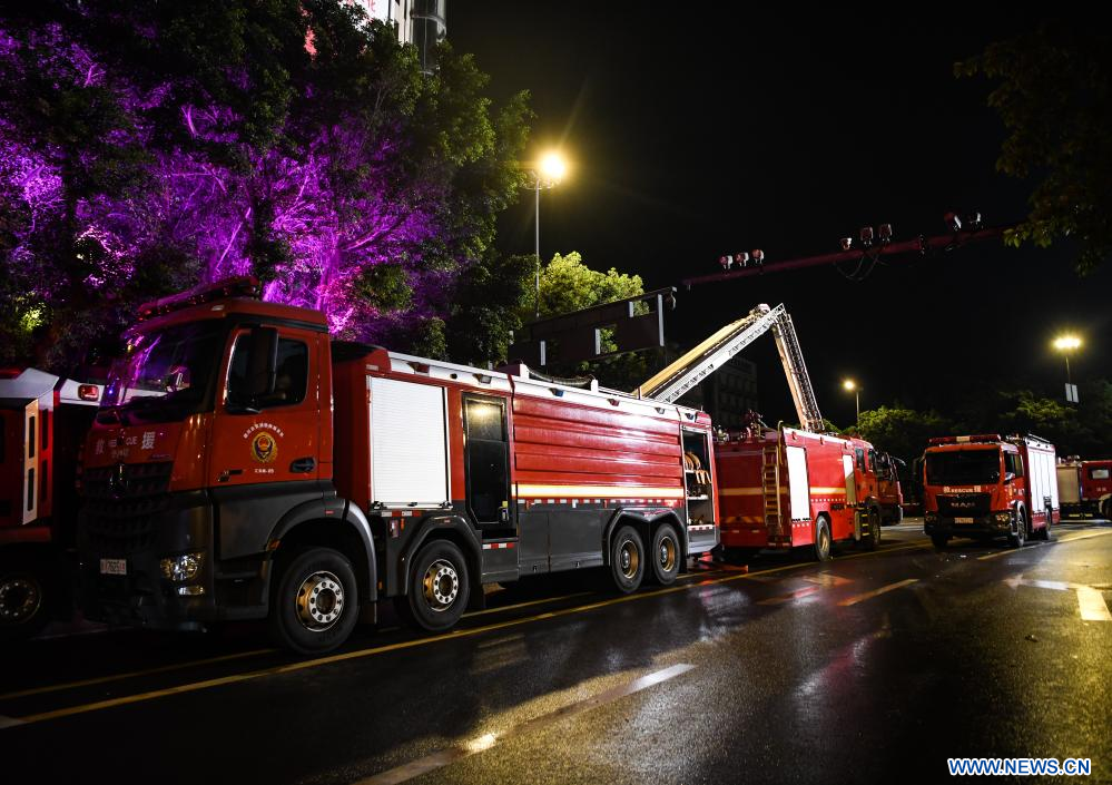 Photo de véhicules de pompiers sur le site de l'incendie survenu dans un grand magasin de la ville de Zigong, dans la province du Sichuan, dans le sud-ouest de la Chine, le 18 juillet 2024. L'opération de secours a été achevée jeudi à 03H00, selon le centre local de lutte contre les incendies et de secours. Au total, 16 personnes ont été tuées, et aucune personne ne reste prise au piège. L'incendie survenu dans l'immeuble de 14 étages, situé dans une zone de haute technologie de la ville, a été signalé mercredi vers 18H00, et une épaisse fumée se dégageait des lieux. Selon les premiers éléments de l'enquête, l'incendie a été provoqué par des travaux de construction. (Photo : Wang Xi)