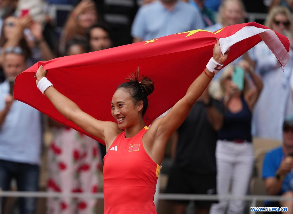 La Chinoise Zheng Qinwen célèbre sa victoire après la finale du simple dames de tennis contre la Croate Donna Vekic, aux Jeux olympiques de Paris 2024 à Paris, en France, le 3 août 2024. (Xinhua/Wan Xiang)