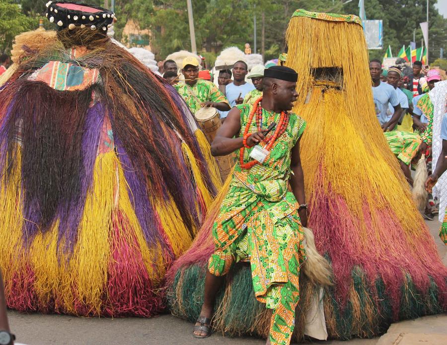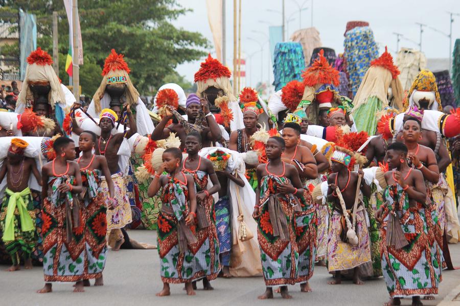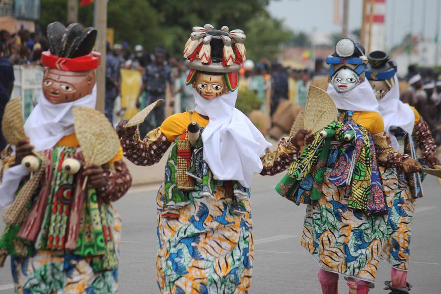 PORTO-NOVO, 5 août (Xinhua) -- Des personnes costumées participent à un défilé de masques lors du Festival des masques de Porto-Novo, au Bénin, le 4 août 2024. Le festival s'est tenu ici de vendredi à dimanche pour présenter l'art et la culture de la religion traditionnelle du Bénin, le vodun, à travers un défilé de masques, des concerts, des séminaires et d'autres activités. (Xinhua/Seraphin Zounyekpe)