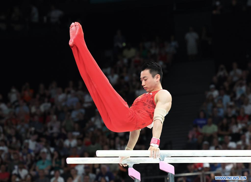 Le Chinois Zou Jingyuan lors de la finale des barres parallèles masculines de gymnastique artistique aux Jeux olympiques de Paris 2024 à Paris, en France, le 5 août 2024. Il a remporté l'or. (Xinhua/Lai Xiangdong)
