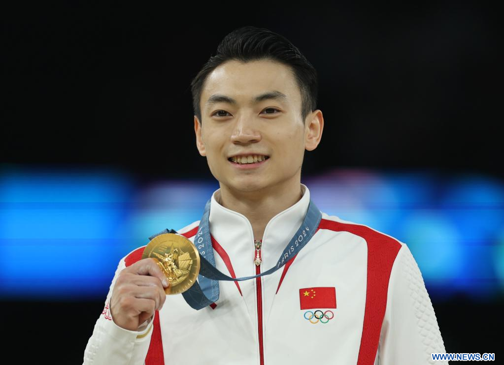 Le médaillé d'or chinois Zou Jingyuan lors de la cérémonie de remise des prix après la finale des barres parallèles masculines de gymnastique artistique aux Jeux olympiques de Paris 2024 à Paris, en France, le 5 août 2024. (Xinhua/Cao Can)