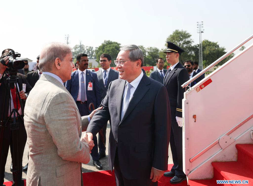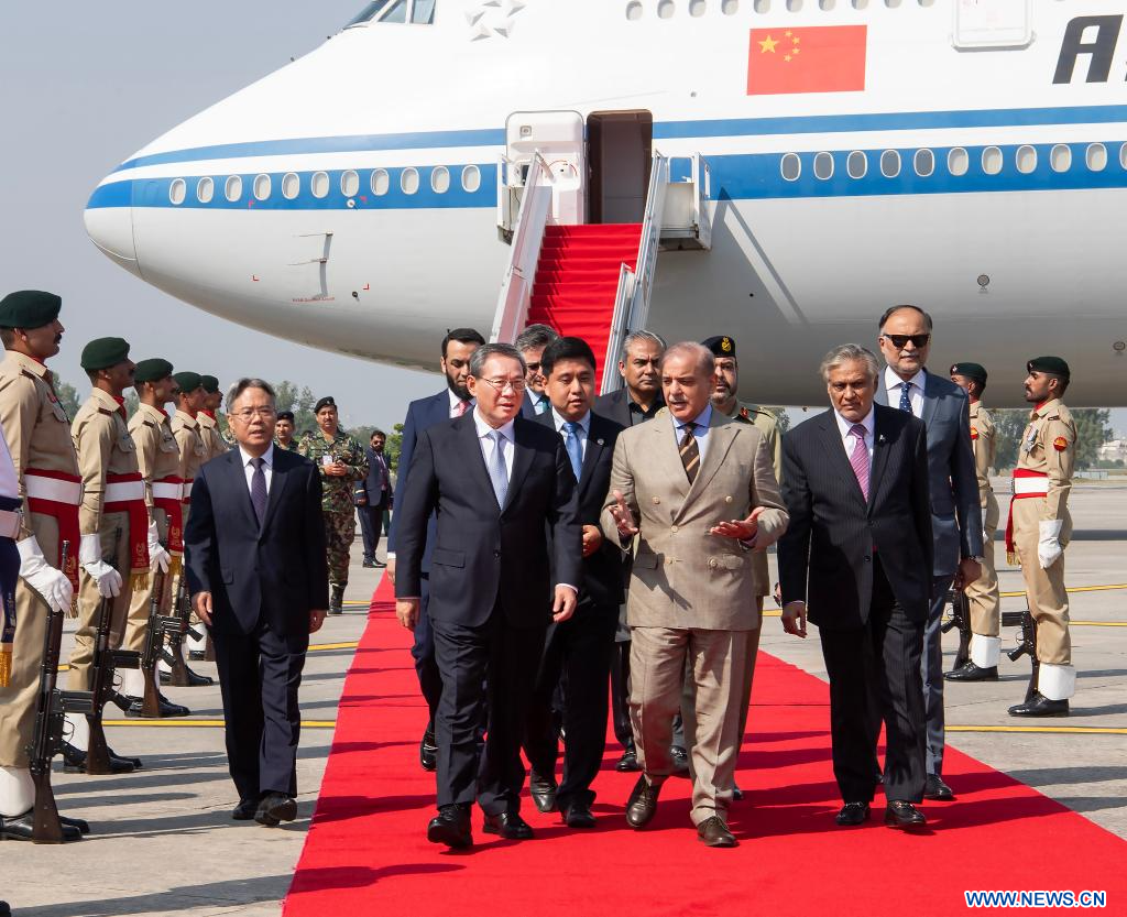 ISLAMABAD, 14 octobre (Xinhua) -- Le Premier ministre chinois Li Qiang est arrivé lundi dans la capitale pakistanaise Islamabad pour participer à la 23e réunion du Conseil des chefs de gouvernement des Etats membres de l'Organisation de coopération de Shanghai (OCS).