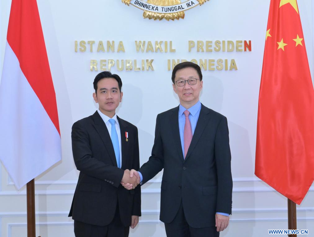 JAKARTA, 21 octobre (Xinhua) -- Le vice-président chinois Han Zheng, en visite en Indonésie, a rencontré lundi le nouveau vice-président indonésien Gibran Rakabuming Raka.