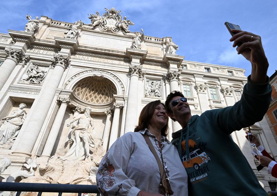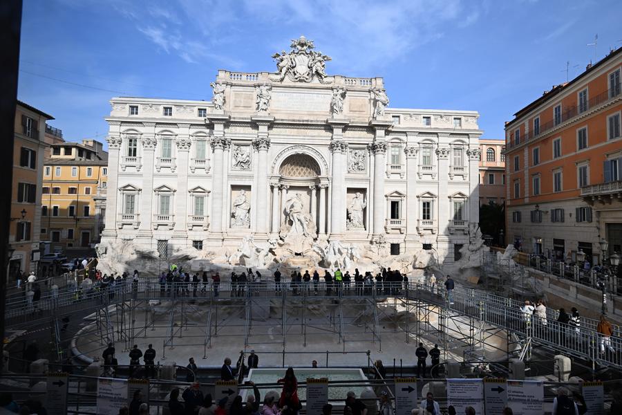 ROME, 9 novembre (Xinhua) -- Photo prise le 9 novembre 2024 de la fontaine de Trevi à Rome, en Italie. Rome a inauguré samedi une passerelle haute le long du front de la fontaine de Trevi alors que le monument baroque se trouve en cours de maintenance. Ce réaménagement offrira aux visiteurs une vue plus rapprochée du site, tout en assurant un flux régulier des visiteurs. (Xinhua/Alberto Lingria)Photo prise le 9 novembre 2024 montrant des touristes en train de visiter la fontaine de Trevi par l'emprunt d'une nouvelle passerelle à Rome, en Italie. (Xinhua/Alberto Lingria)Photo prise le 9 novembre 2024 montrant des touristes en train de prendre un selfie devant la fontaine de Trevi sur une nouvelle passerelle à Rome, en Italie. (Xinhua/Alberto Lingria)