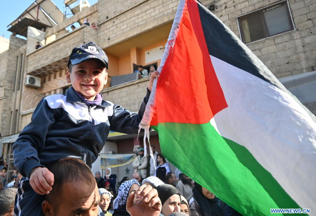 DAMAS, 18 janvier (Xinhua) -- Des personnes se rassemblent pour célébrer l'accord de cessez-le-feu dans la bande de Gaza récemment conclu entre Israël et le Hamas, à Damas, en Syrie, le 17 janvier 2025.