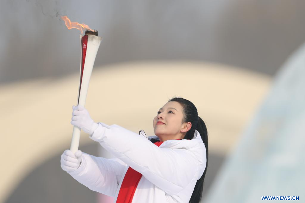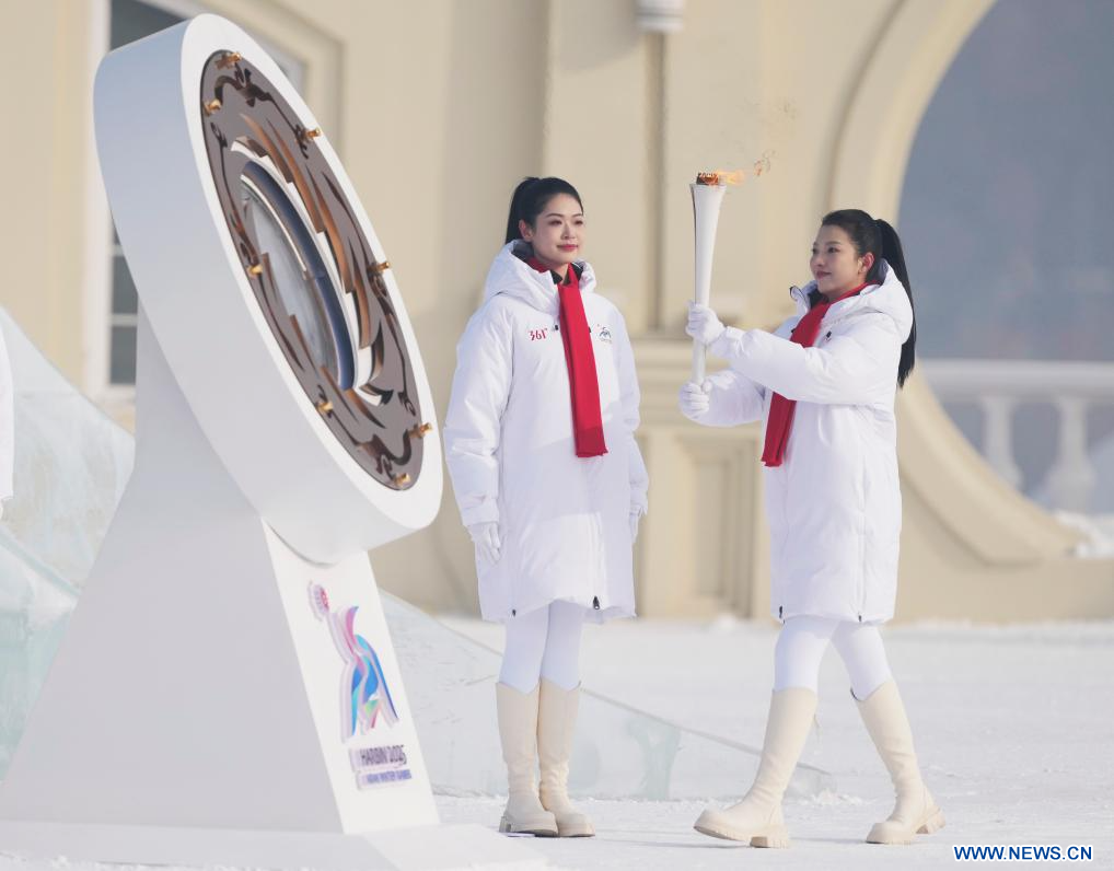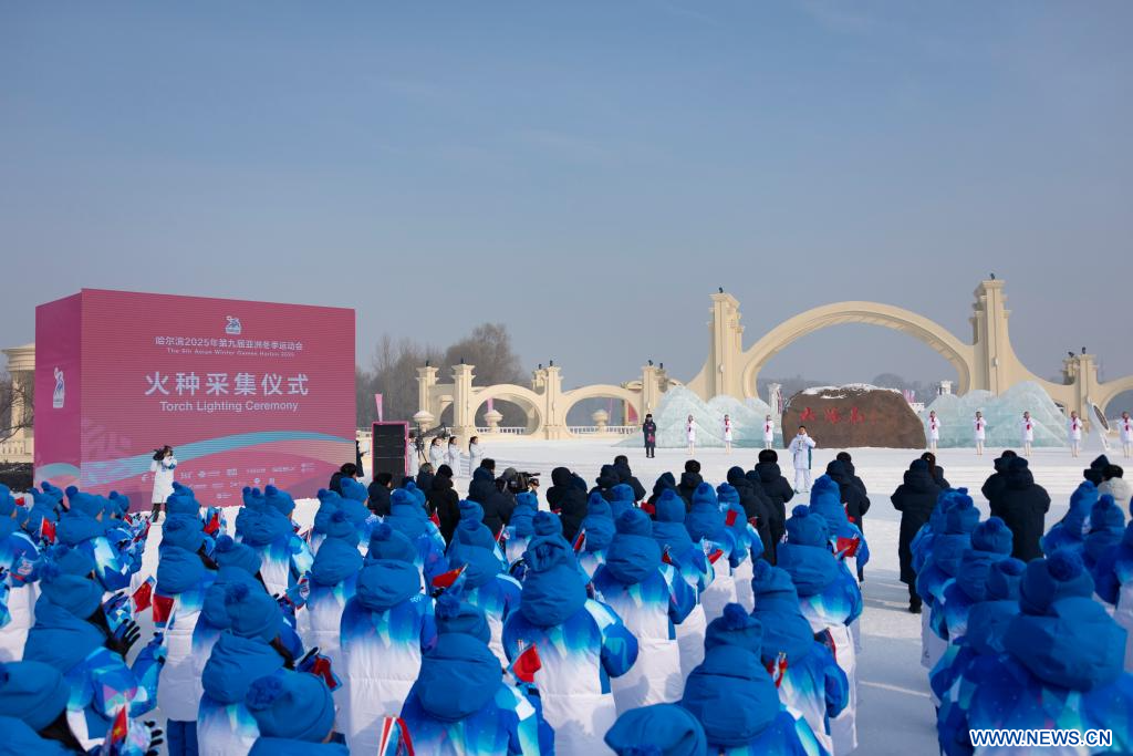 HARBIN, 21 janvier (Xinhua) -- Photo de la cérémonie d'allumage de la flamme pour les Jeux asiatiques d'hiver de Harbin 2025 dans le site touristique de l'île du Soleil à Harbin, dans la province chinoise du Heilongjiang (nord-est), le 20 janvier 2025. (Photo : Xie Jianfei)