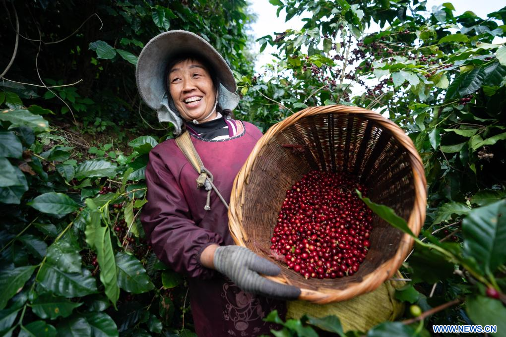 KUNMING, 28 janvier (Xinhua) -- Une agricultrice présente les fruits du café dans un manoir à Pu'er, dans la province chinoise du Yunnan (sud-ouest), le 8 janvier 2025. A l'approche du Nouvel An chinois, de nombreux visiteurs, ayant séjourné au Yunnan, choisissent de ramener chez eux des sacs de grains de café qu'ils ont eux-mêmes torréfiés. Ces grains sont devenus un cadeau de fête particulier cette année, aussi bien pour les amis et la famille qu'à un usage personnel. (Photo : Chen Xinbo)