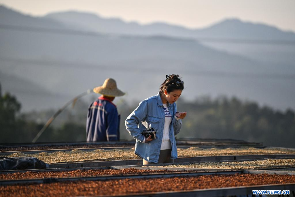 KUNMING, 28 janvier (Xinhua) -- Une touriste examine des grains de café dans un domaine de café à Pu'er, dans la province chinoise du Yunnan (sud-ouest), le 7 janvier 2025. A l'approche du Nouvel An chinois, de nombreux visiteurs, ayant séjourné au Yunnan, choisissent de ramener chez eux des sacs de grains de café qu'ils ont eux-mêmes torréfiés. Ces grains sont devenus un cadeau de fête particulier cette année, aussi bien pour les amis et la famille qu'à un usage personnel. (Photo : Sun Ruibo)