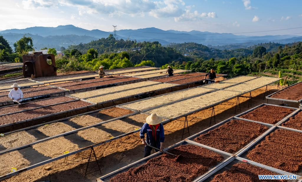 KUNMING, 28 janvier (Xinhua) -- Photo aérienne prise par un drone montrant des ouvriers en train de sécher des grains de café dans un manoir à Pu'er, dans la province chinoise du Yunnan (sud-ouest), le 7 janvier 2025. A l'approche du Nouvel An chinois, de nombreux visiteurs, ayant séjourné au Yunnan, choisissent de ramener chez eux des sacs de grains de café qu'ils ont eux-mêmes torréfiés. Ces grains sont devenus un cadeau de fête particulier cette année, aussi bien pour les amis et la famille qu'à un usage personnel. (Photo : Chen Xinbo)