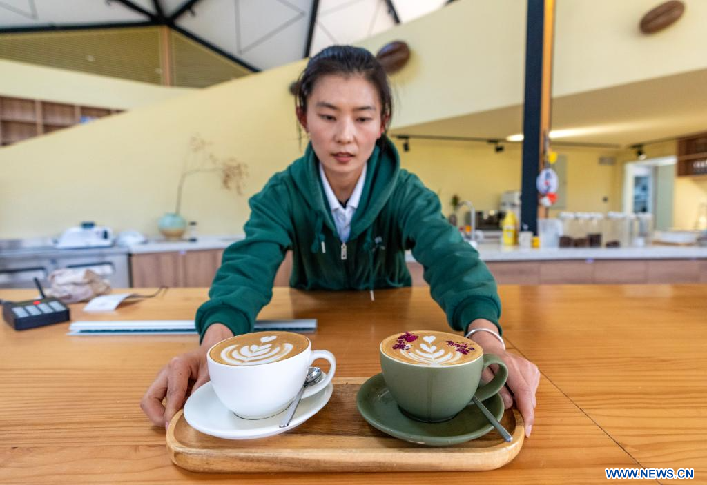 KUNMING, 28 janvier (Xinhua) -- Une employée sert du café à des clients dans un centre d'expérience à Pu'er, dans la province chinoise du Yunnan (sud-ouest), le 7 janvier 2025. A l'approche du Nouvel An chinois, de nombreux visiteurs, ayant séjourné au Yunnan, choisissent de ramener chez eux des sacs de grains de café qu'ils ont eux-mêmes torréfiés. Ces grains sont devenus un cadeau de fête particulier cette année, aussi bien pour les amis et la famille qu'à un usage personnel. (Photo : Chen Xinbo)