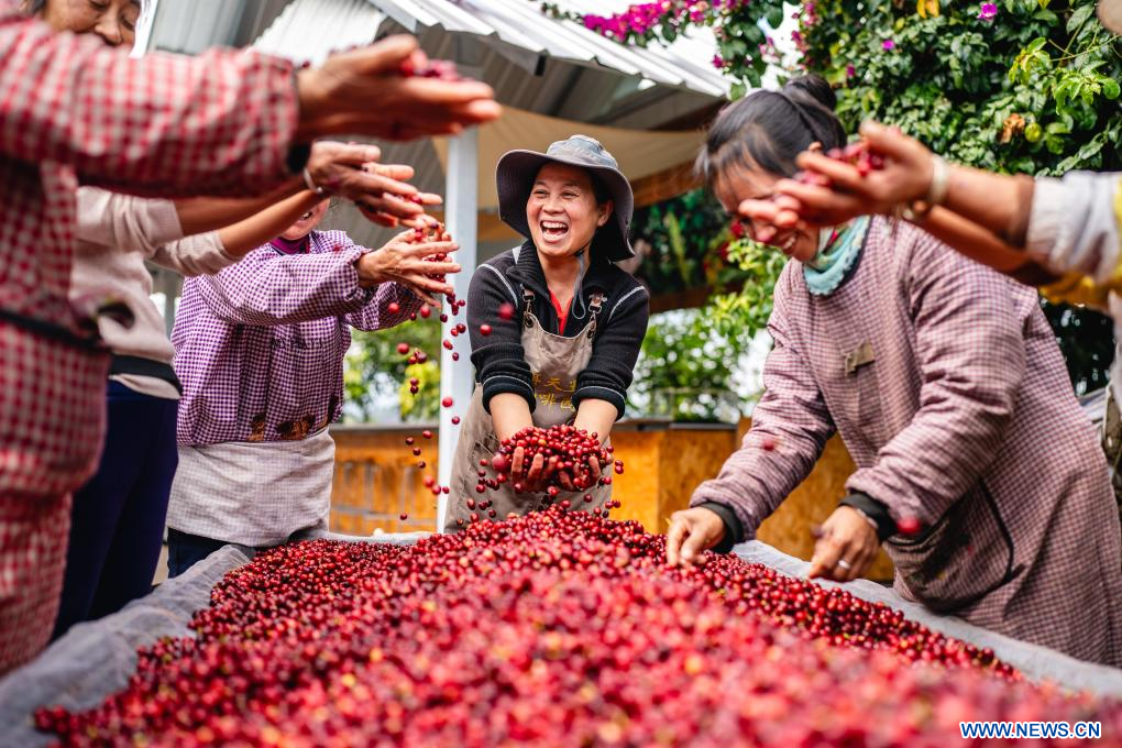 KUNMING, 28 janvier (Xinhua) -- Des ouvriers célèbrent la récolte de café de cette année à Pu'er, dans la province chinoise du Yunnan (sud-ouest), le 8 janvier 2025. A l'approche du Nouvel An chinois, de nombreux visiteurs, ayant séjourné au Yunnan, choisissent de ramener chez eux des sacs de grains de café qu'ils ont eux-mêmes torréfiés. Ces grains sont devenus un cadeau de fête particulier cette année, aussi bien pour les amis et la famille qu'à un usage personnel. (Photo : Hu Chao)