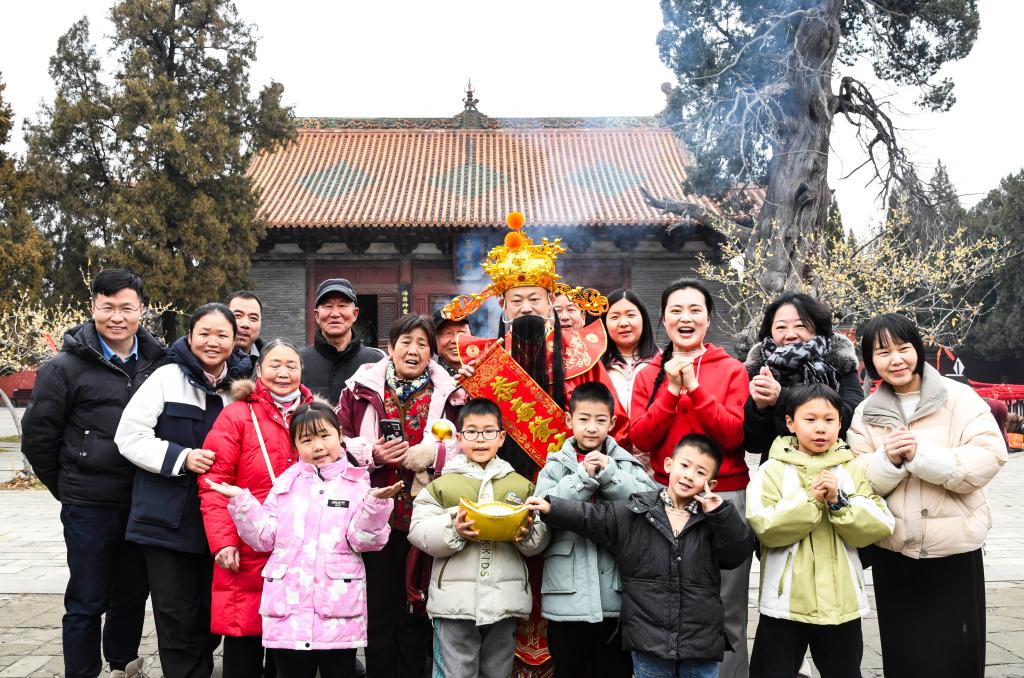BEIJING, 2 février (Xinhua) -- Des touristes posent pour des photos avec un membre du personnel habillé en "Dieu de la richesse" au Temple Jidu, à Jiyuan, dans la province chinoise du Henan (centre), le 2 février 2025.