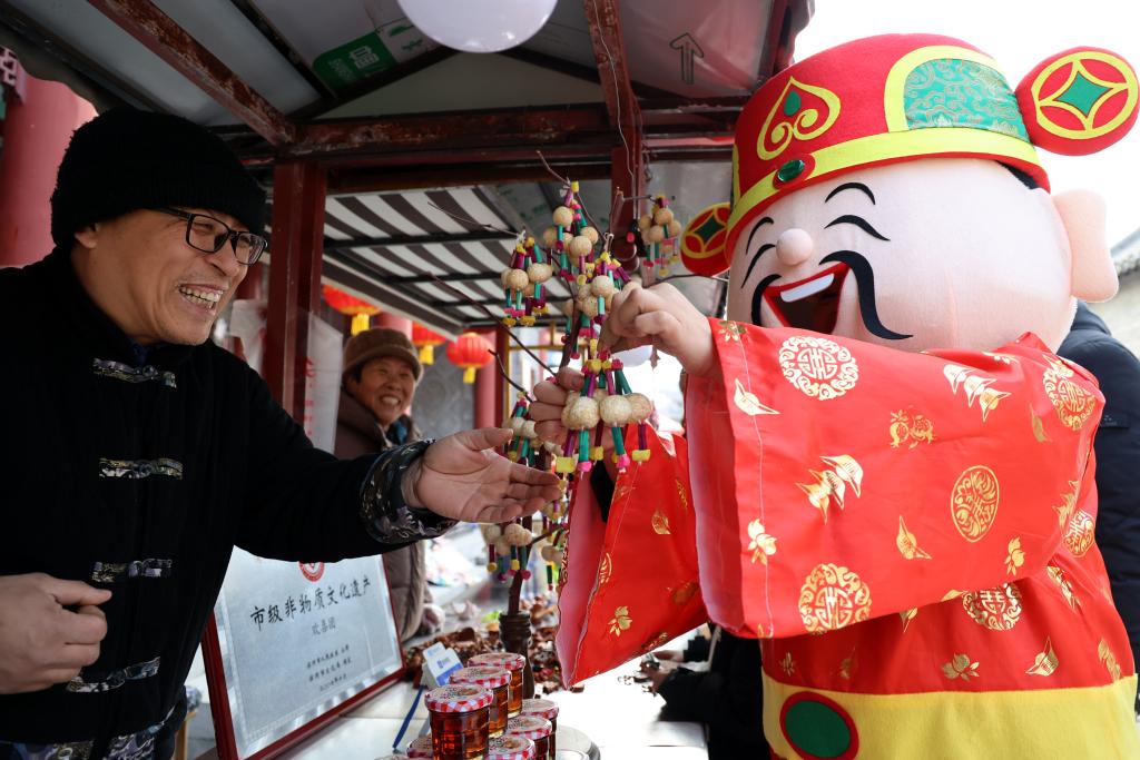 BEIJING, 2 février (Xinhua) -- Un membre du personnel habillé en "Dieu de la richesse" offre des bénédictions à un marchand dans un site touristique du district de Wudi, à Binzhou, dans la province chinoise du Shandong (est), le 2 février 2025.
