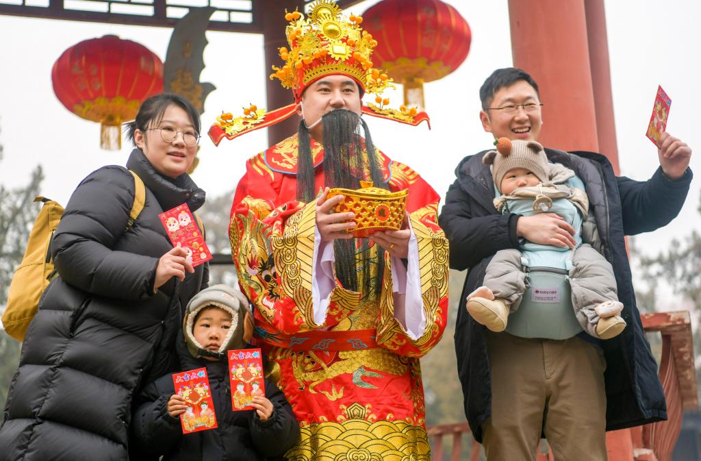 BEIJING, 2 février (Xinhua) -- Des touristes posent pour des photos avec un membre du personnel habillé en "Dieu de la richesse" dans le site touristique de Guanlin, à Luoyang, dans la province chinoise du Henan (centre), le 2 février 2025.