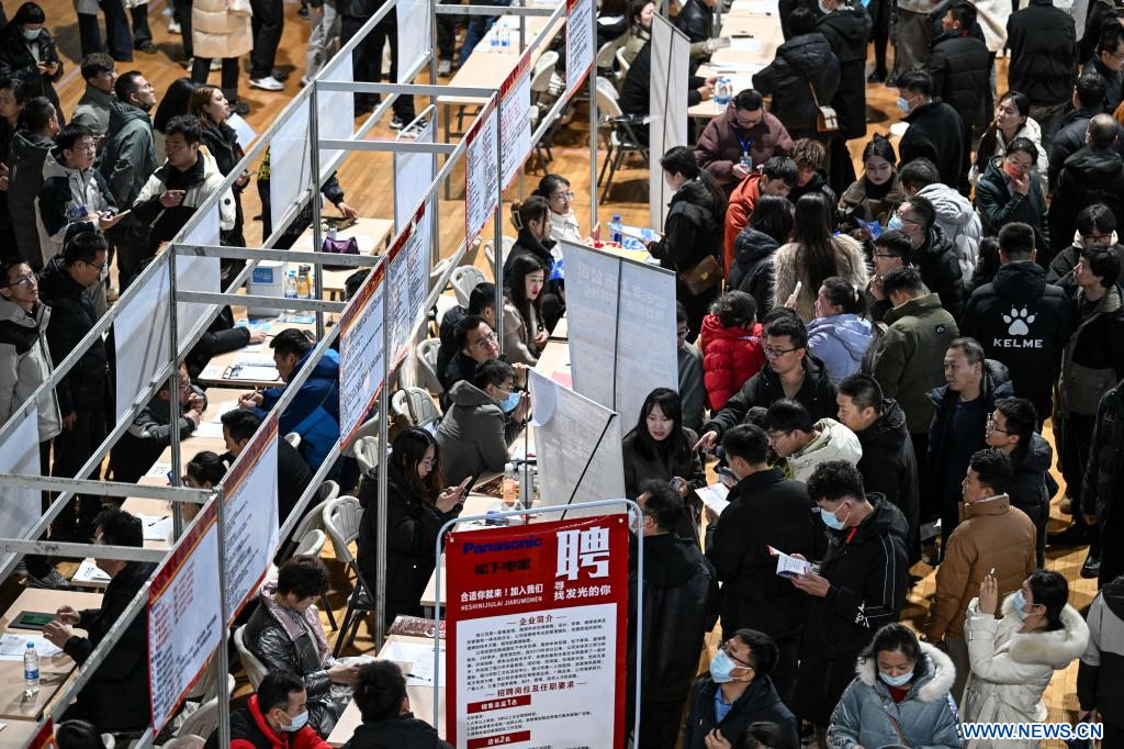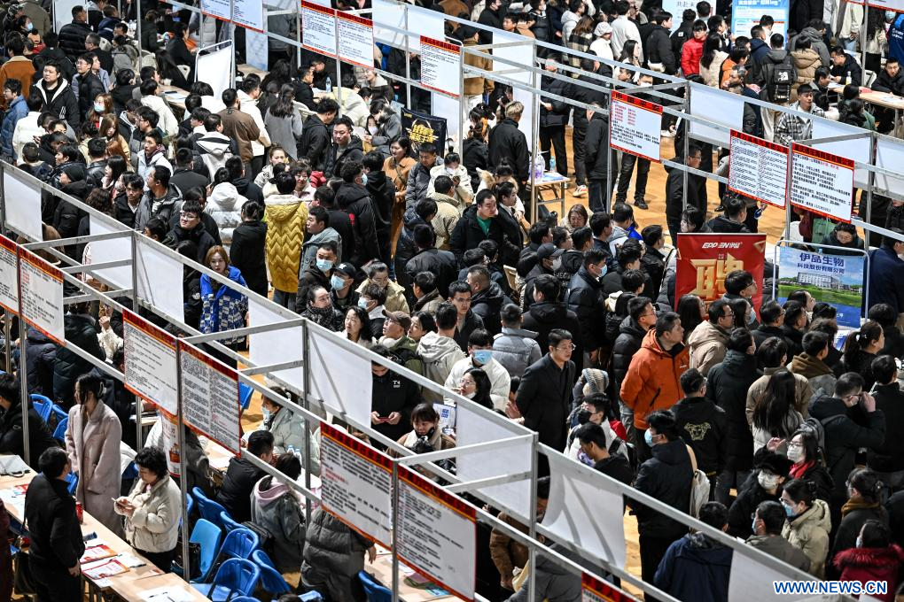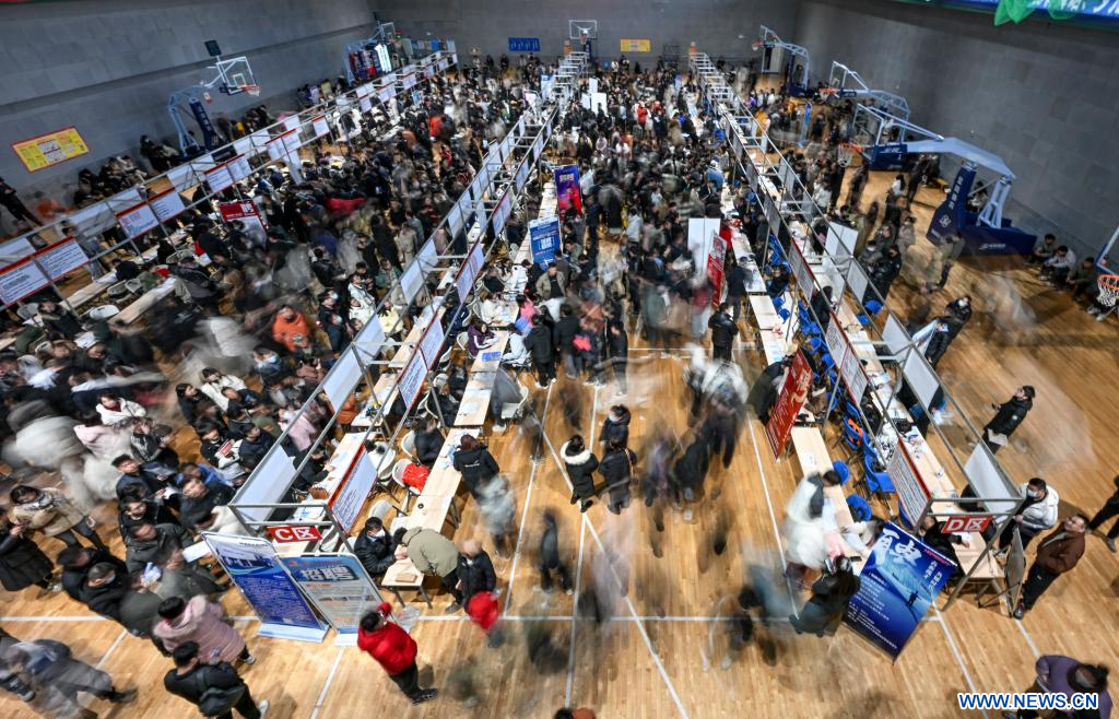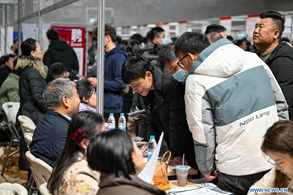 YINCHUAN, 16 février (Xinhua) -- Des demandeurs d'emploi participent à un salon de l'emploi organisé à Yinchuan, dans la région autonome Hui du Ningxia, dans le nord-ouest de la Chine, le 15 février 2025. Ce salon de l'emploi a débuté samedi à Yinchuan. Plus de 200 entreprises de diverses industries, telles que les nouvelles énergies, la biotechnologie et le commerce électronique, y proposent plus de 4.000 postes. (Photo : Feng Kaihua)