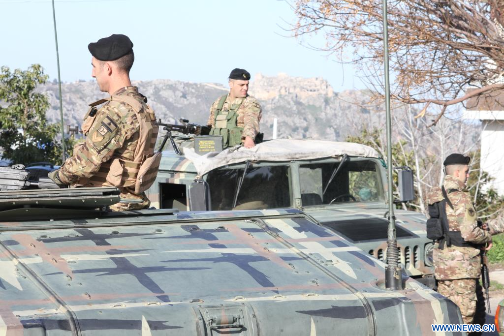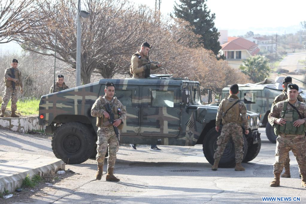 KFAR KILA, 18 février (Xinhua) -- Photo prise le 18 février 2025 montrant des membres de l'armée libanaise se positionnant à l'entrée de Kfar Kila, au Liban, après le retrait de l'armée israélienne. Un responsable du gouvernement israélien avait déclaré lundi que l'armée du pays maintiendrait des troupes dans cinq postes au sud du Liban, malgré la date limite pour son retrait total expirant mardi. (Xinhua/Taher Abu Hamdan)