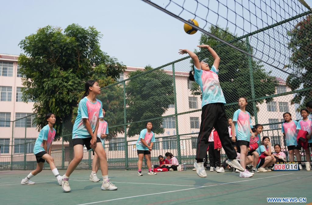 RUILI, 1er avril (Xinhua) -- Des élèves jouent au volley-ball dans la cour de récréation d'une école primaire à Ruili, ville de la province chinoise du Yunnan (sud-ouest), le 31 mars 2025. (Photo : Chen Xinbo)