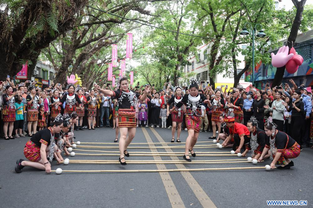 WUZHISHAN, 2 avril (Xinhua) -- Des gens exécutent la danse du bambou lors d'une célébration du Festival Sanyuesan à Wuzhishan, ville de la province chinoise de Hainan (sud), le 31 mars 2025. La population locale a organisé divers événements à Wuzhishan pour célébrer le Festival Sanyuesan qui tombe le troisième jour du troisième mois lunaire. (Photo : Zhang Liyun)