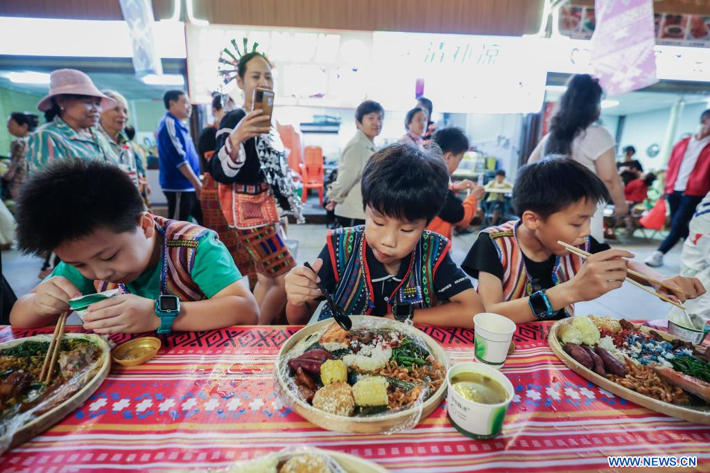 WUZHISHAN, 2 avril (Xinhua) -- Des touristes prennent part à un festin traditionnel lors des célébrations du Festival Sanyuesan à Wuzhishan, ville de la province chinoise de Hainan (sud), le 30 mars 2025. La population locale a organisé divers événements à Wuzhishan pour célébrer le Festival Sanyuesan qui tombe le troisième jour du troisième mois lunaire. (Photo : Zhang Liyun)