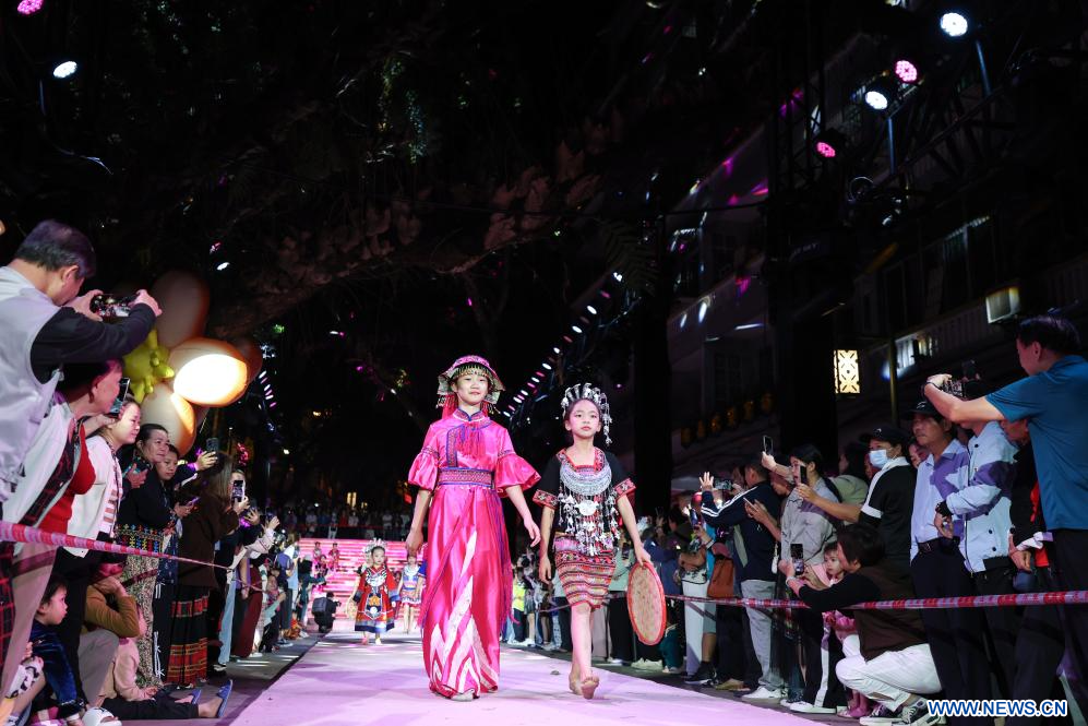 WUZHISHAN, 2 avril (Xinhua) -- Des gens assistent à un défilé de mode locale lors des célébrations du Festival Sanyuesan à Wuzhishan, ville de la province chinoise de Hainan (sud), le 30 mars 2025. La population locale a organisé divers événements à Wuzhishan pour célébrer le Festival Sanyuesan qui tombe le troisième jour du troisième mois lunaire. (Photo : Zhang Liyun)