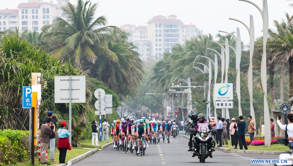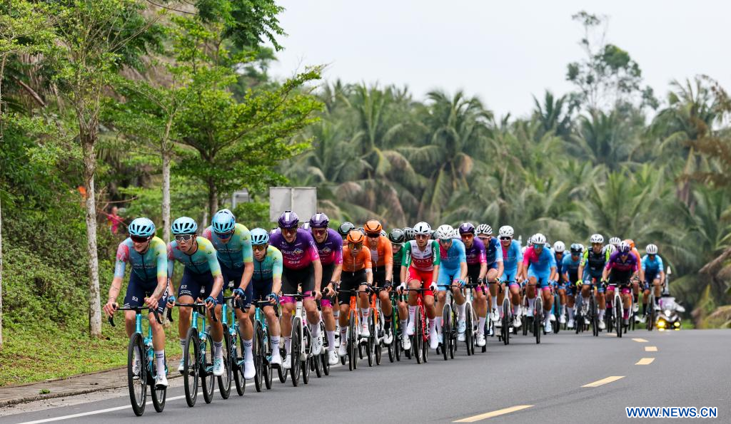 QIONGHAI, 8 avril (Xinhua) -- Des cyclistes participent à la première étape du 16e Tour de Hainan lundi à Qionghai, dans la province de Hainan, dans le sud de la Chine, le 7 avril 2025. (Photo : Yang Guanyu)