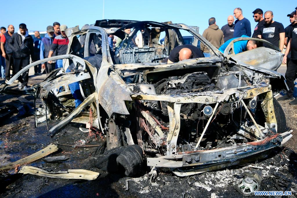 SIDON, 19 avril (Xinhua) -- Photo prise le 18 avril 2025 montrant une voiture détruite lors d'une attaque de drone israélien à Sidon, au Liban. Un membre du Hezbollah a été tué vendredi lors d'une frappe de drone israélienne dans la ville de Sidon, dans le sud du Liban, selon les autorités sanitaires libanaises et une source de sécurité. (Xinhua/Ali Hashisho)