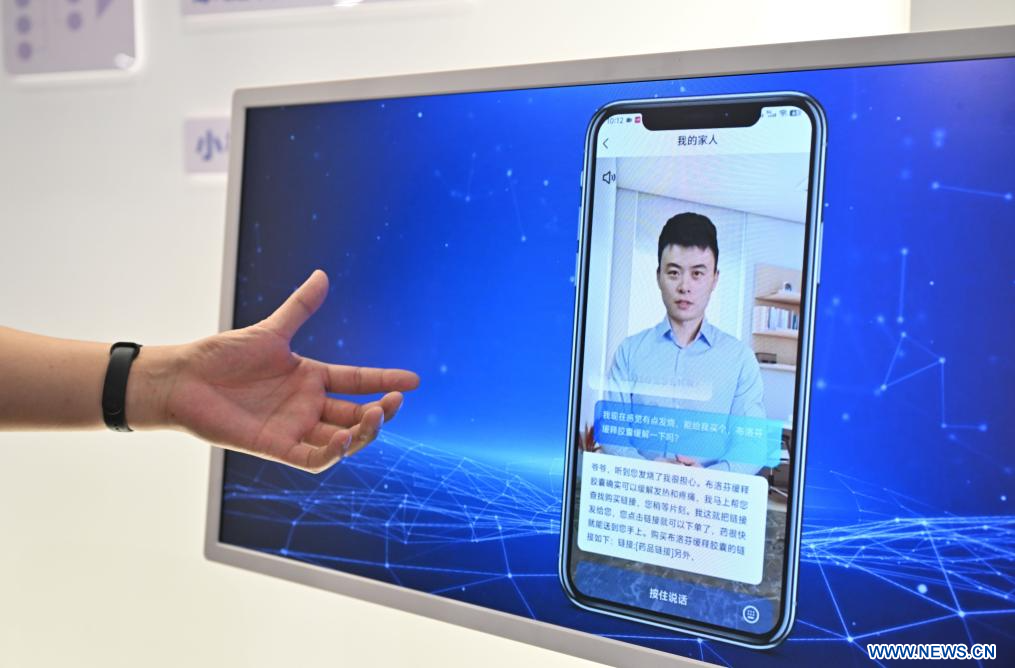 TIANJIN, 22 avril (Xinhua) -- Un employé présente un humain numérique basé sur la technologie d'IA et appliqué aux soins à domicile pour les personnes âgées, à Tianjin Xiaocheng Group Co., Ltd, dans le nord de la Chine, le 18 avril 2025.