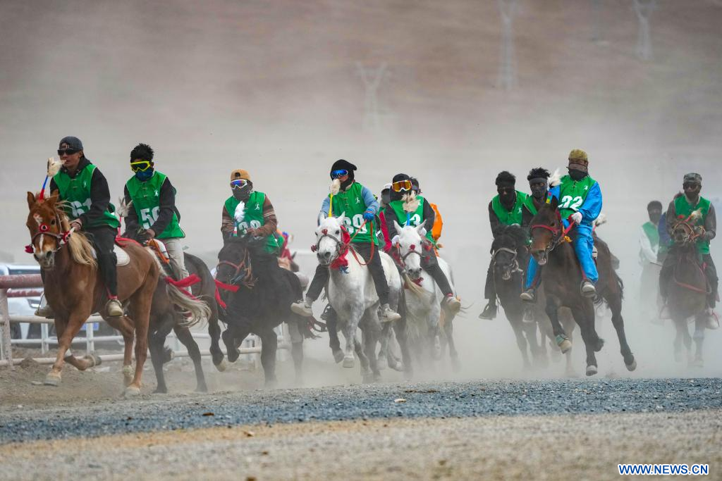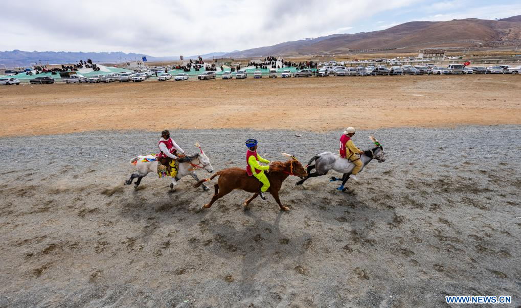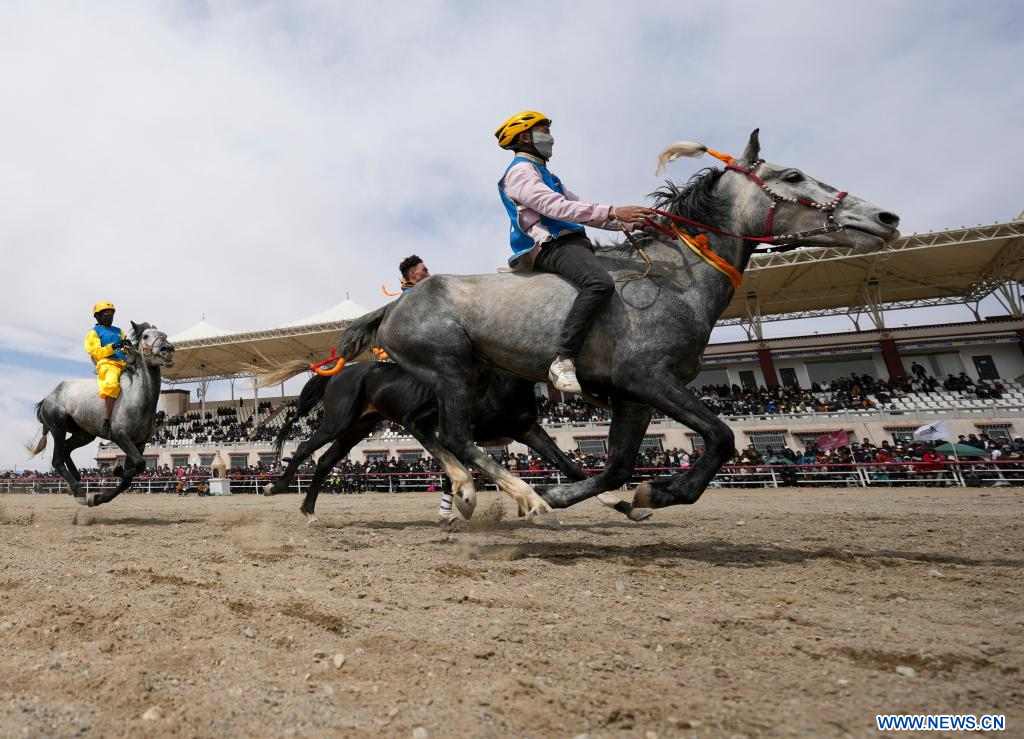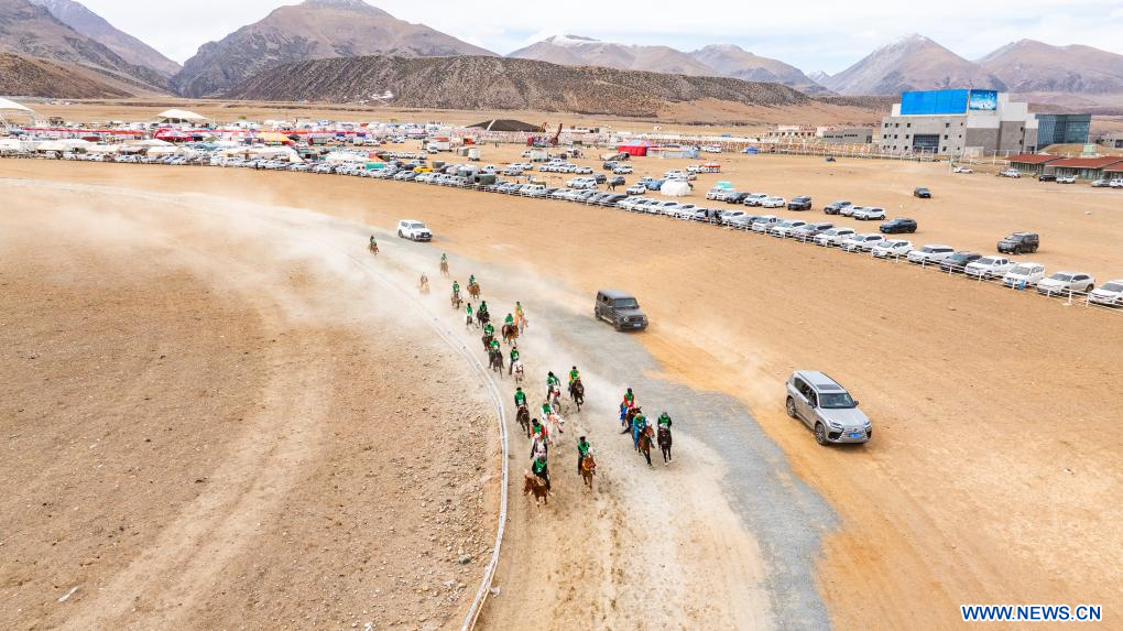 LHASSA, 28 avril (Xinhua) -- Des cavaliers en compétition lors d'une course équestre sur invitation dans le district de Damxung de la région autonome du Xizang, dans le sud-ouest de la Chine, le 26 avril 2025. L'événement, qui se déroule du 23 au 28 avril à l'hippodrome du district de Damxung, réunit 403 chevaux engagés dans 12 compétitions, comprenant notamment des épreuves d'endurance et de vitesse. (Photo : Jigme Dorje)