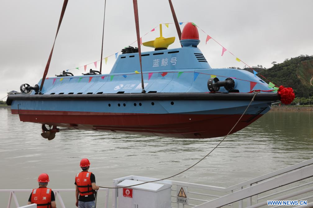 GUANGZHOU, 28 avril (Xinhua) -- "Baleine bleue" ("Blue Whale"), un navire de surface submersible, sans pilote, à grande vitesse et à la pointe de la technologie, a été lancé lundi à Zhuhai, dans la province chinoise du Guangdong (sud).