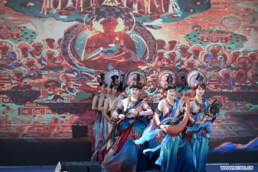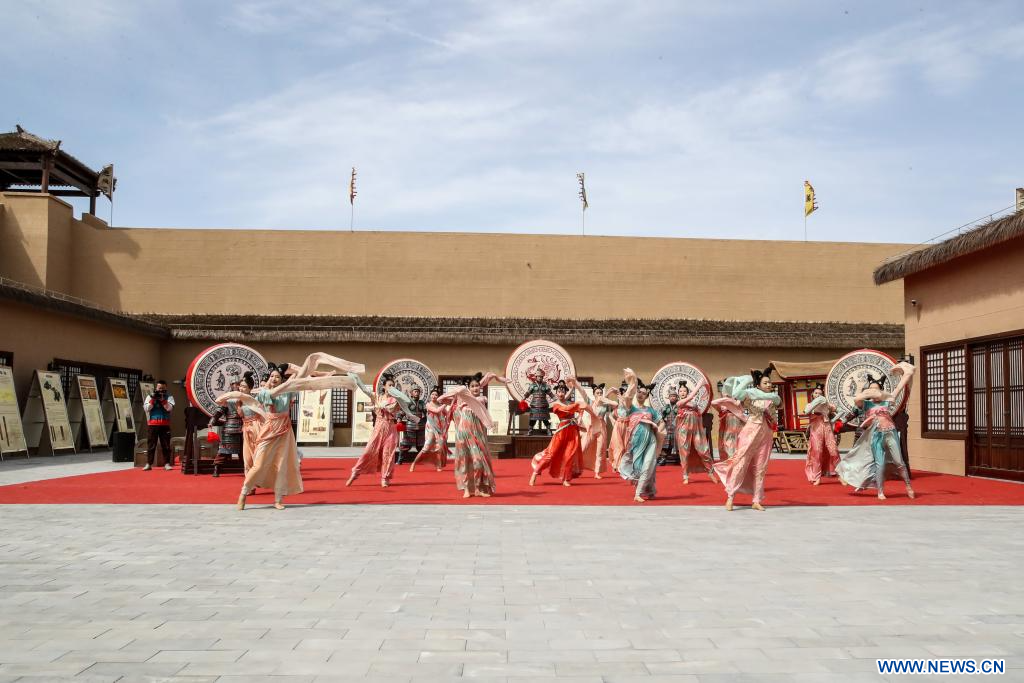 DUNHUANG, 2 mai (Xinhua) -- Des artistes se produisent en dansant lors de la cérémonie d'ouverture des ruines de Xuanquanzhi à Dunhuang, dans la province chinoise du Gansu (nord-ouest), le 29 avril 2025.