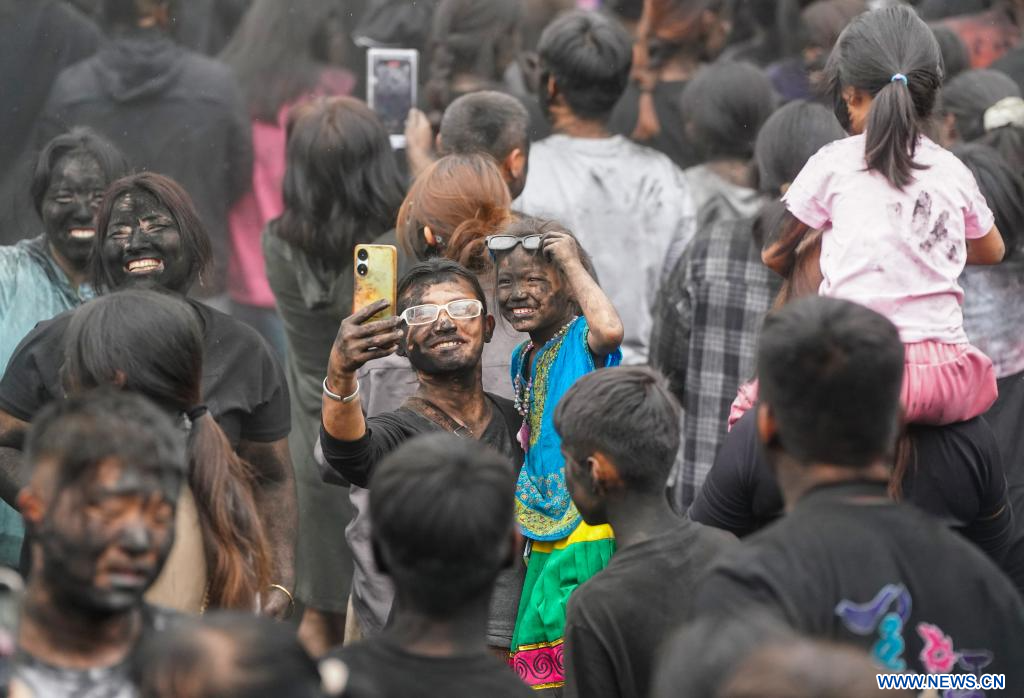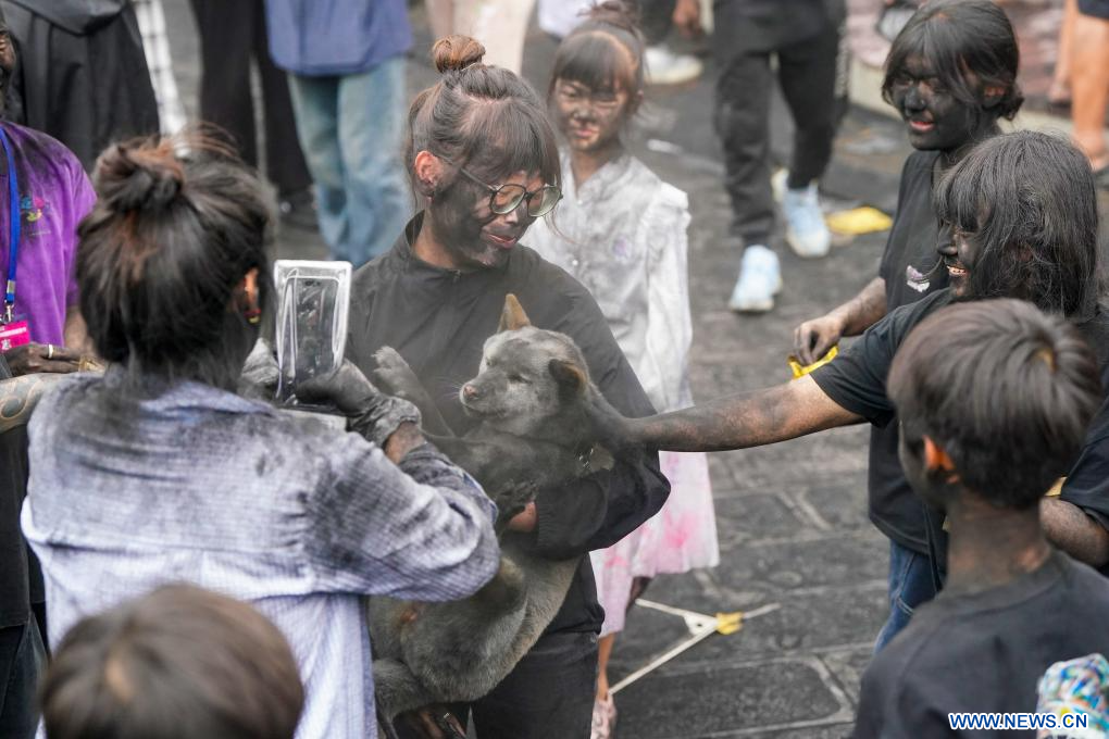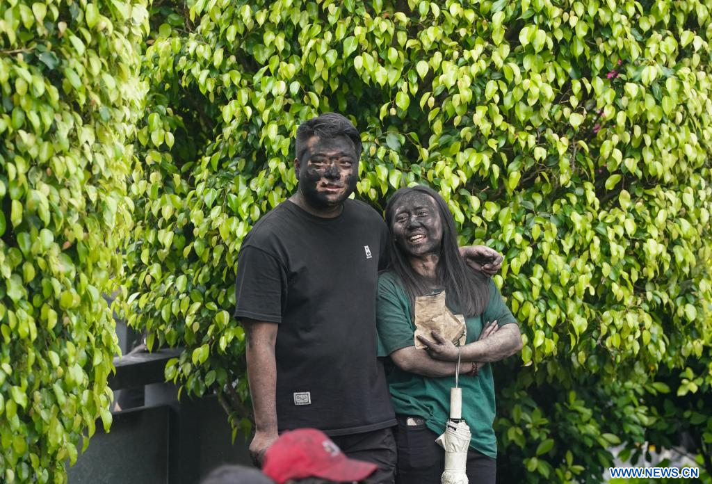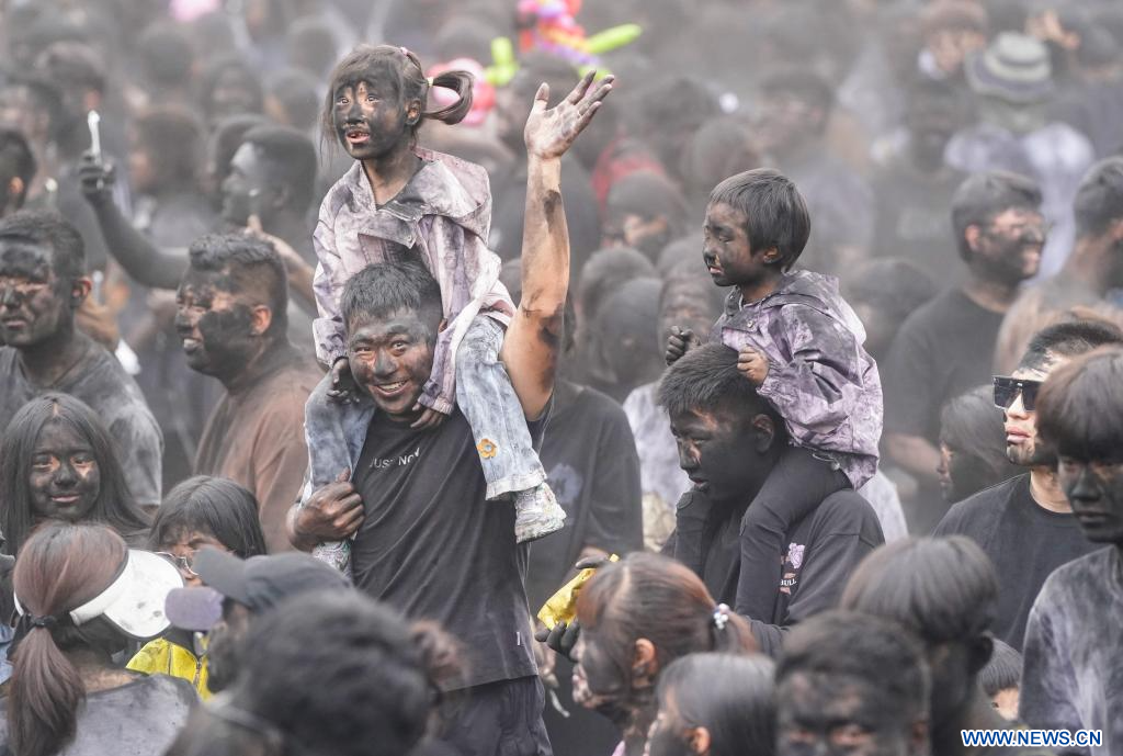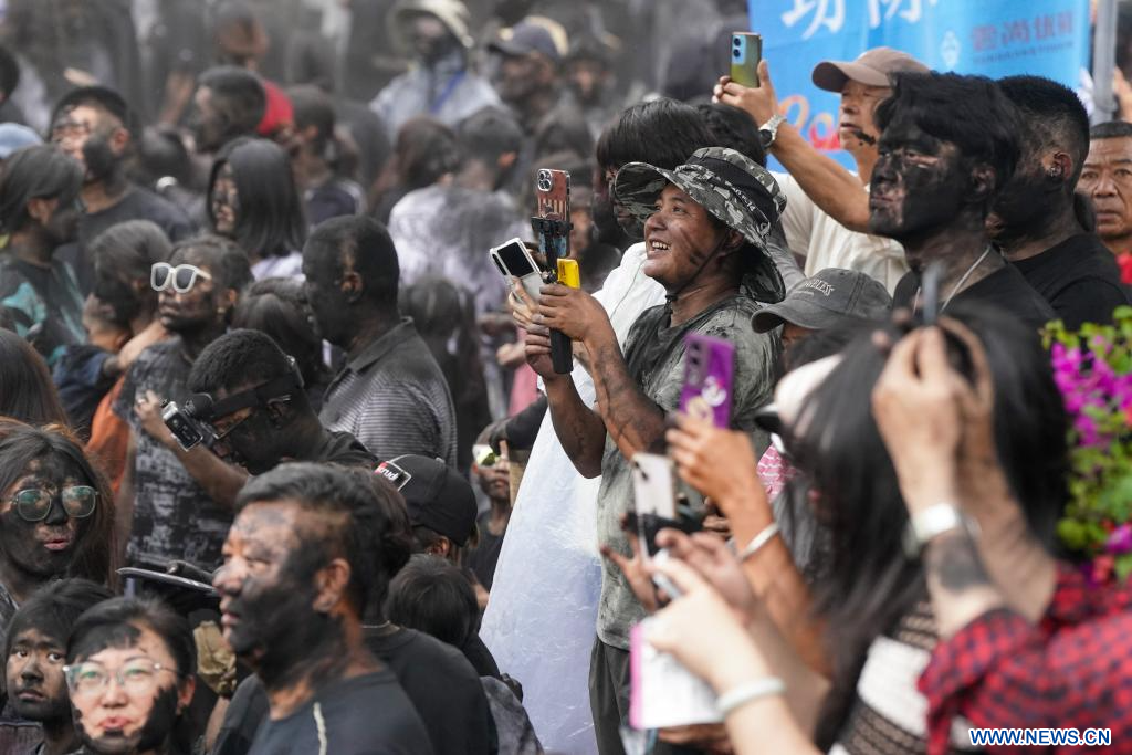 MOJIANG, 3 mai (Xinhua) -- Des gens participent à une fête folklorique appelée "se noircir le visage" dans le district autonome Hani de Mojiang, à Pu'er, dans la province du Yunnan (sud-ouest de la Chine), le 2 mai 2025. Cette fête traditionnelle, qui s'est déroulée vendredi, consiste à s'enduire mutuellement le visage de noir pour attirer la bonne fortune. (Photo : Chen Xinbo)