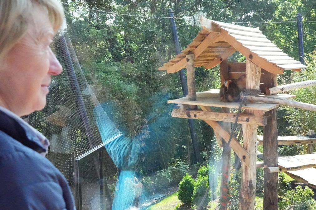 Une femme observe des singes dorés au ZooParc de Beauval à Saint-Aignan, en France, le 7 mai 2025. Trois singes dorés de Chine ont fait leur début mercredi au ZooParc de Beauval, marquant le premier voyage de l'espèce en dehors de l'Asie. (Xinhua/Sun Xinjing)