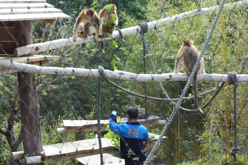 Un soigneur chinois nourrit des singes dorés à l'intérieur d'un enclos au ZooParc de Beauval à Saint-Aignan, en France, le 7 mai 2025. Trois singes dorés de Chine ont fait leur début mercredi au ZooParc de Beauval, marquant le premier voyage de l'espèce en dehors de l'Asie. (Xinhua/Sun Xinjing)