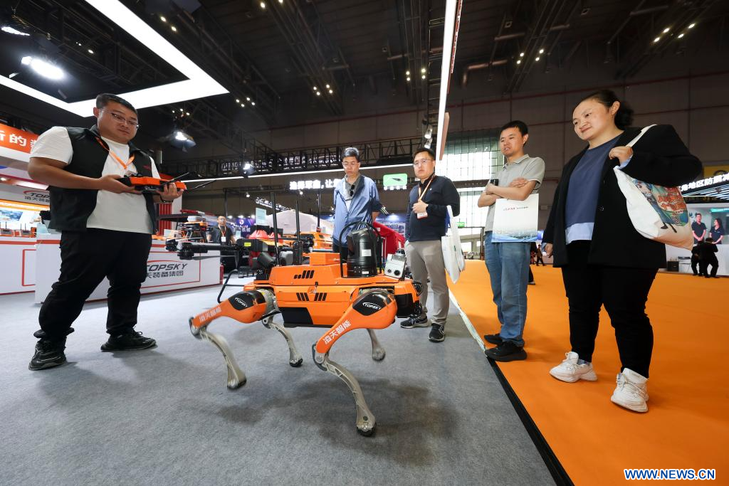 SHANGHAI, 15 mai (Xinhua) -- Un employé présente aux visiteurs un chien robot quadrupède pouvant être utilisé pour les secours d'urgence sur le stand de la Beijing Topsky Intelligent Equipment Group Co., Ltd. lors de la quatrième Exposition internationale sur la réduction des catastrophes et les secours d'urgence du delta du fleuve Yangtsé, à Shanghai, dans l'est de la Chine, le 13 mai 2025. Plus de 3.000 équipements et technologies de pointe sont présentés à l'exposition.