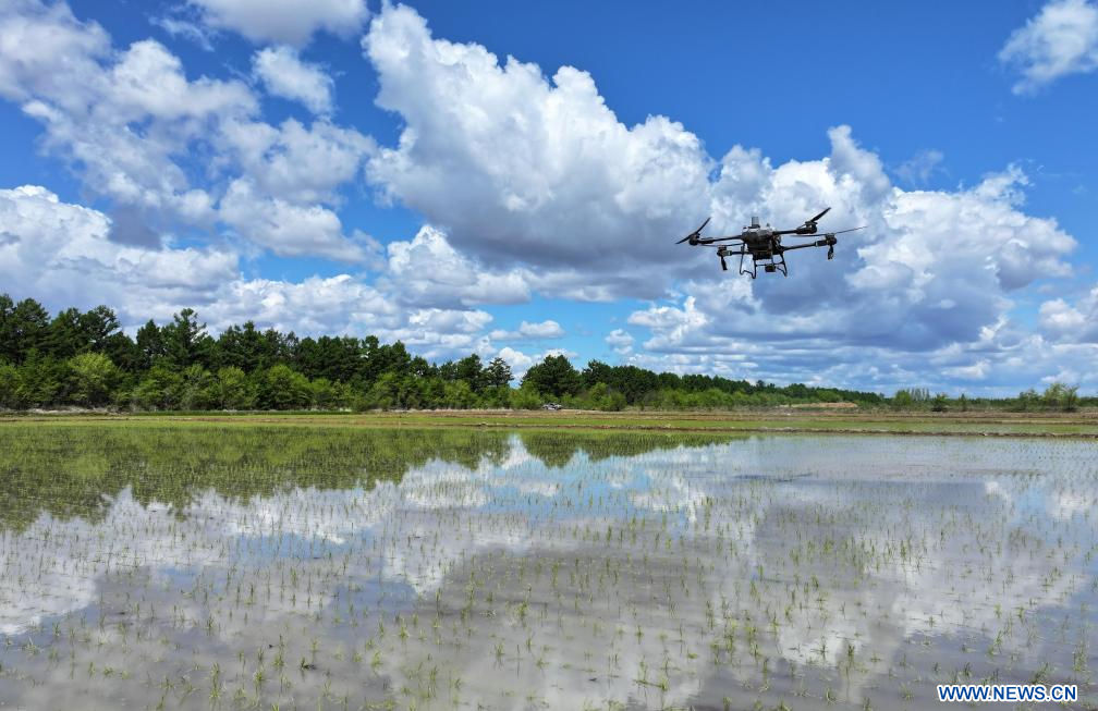 BEIJING, 22 mai (Xinhua) -- Un drone agricole épand de l'engrais sur une rizière exploitée par une filiale du groupe Beidahuang, dans la province chinoise du Heilongjiang (nord-est), le 21 mai 2025.