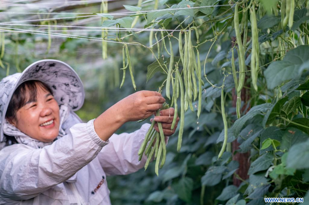 BEIJING, 22 mai (Xinhua) -- Une agricultrice récolte des haricots verts dans une exploitation maraîchère, située dans la préfecture autonome Zhuang et Miao de Wenshan, dans la province chinoise du Yunnan (sud-ouest), le 21 mai 2025.