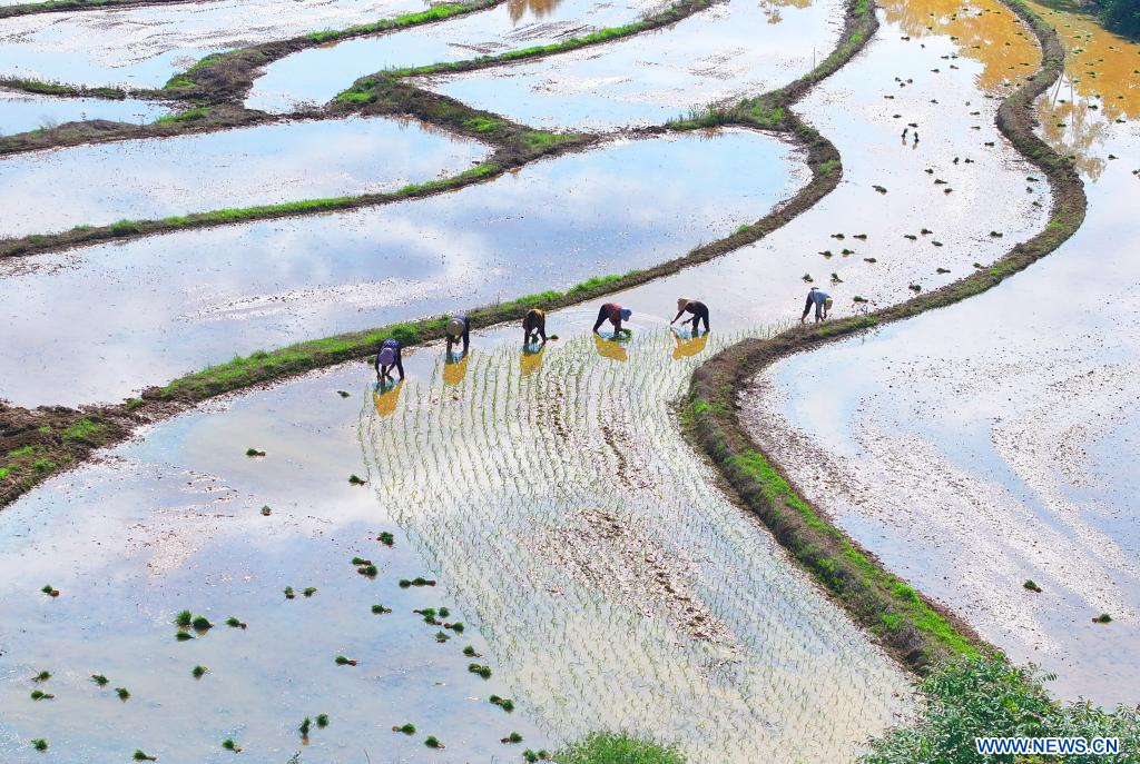 BEIJING, 22 mai (Xinhua) -- Des agriculteurs repiquent des plants de riz dans une rizière, située dans le bourg de Gaohu du district de Hengdong, dans la ville de Hengyang, dans la province chinoise du Hunan (centre), le 21 mai 2025.
