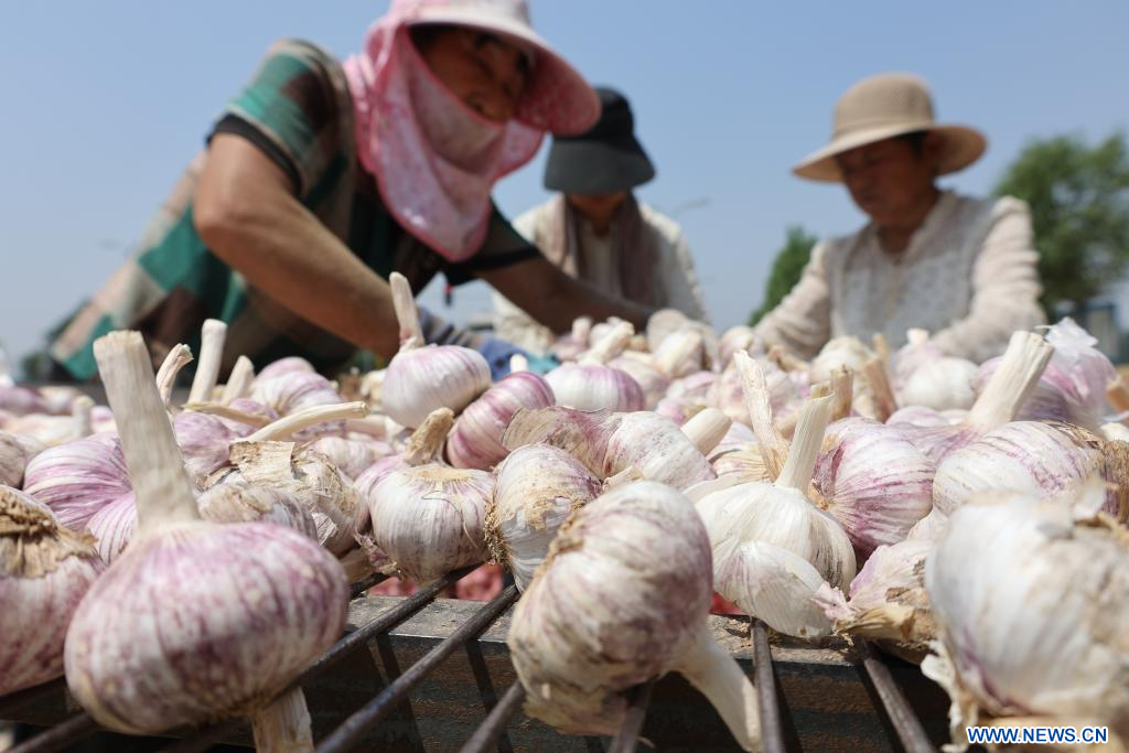 BEIJING, 22 mai (Xinhua) -- Des agriculteurs trient et emballent de l'ail à Kaifeng, dans la province chinoise du Henan (centre), le 21 mai 2025.