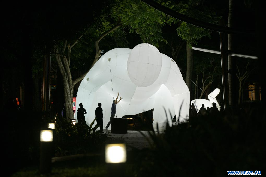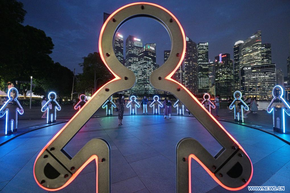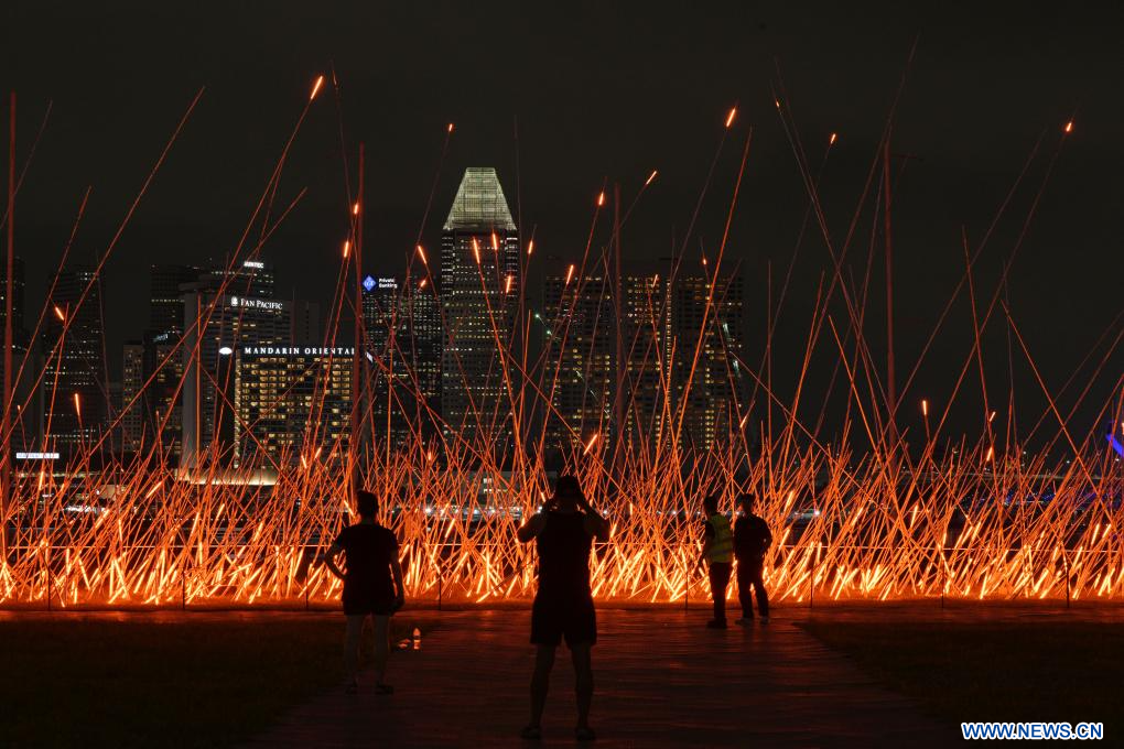 SINGAPOUR, 27 mai (Xinhua) -- Des gens regardent une installation lumineuse lors de l'avant-première du spectacle "i Light Singapore" à Marina Bay à Singapour, le 27 mai 2025. Le spectacle se tiendra du 29 mai au 21 juin. (Xinhua/Then Chih Wey)