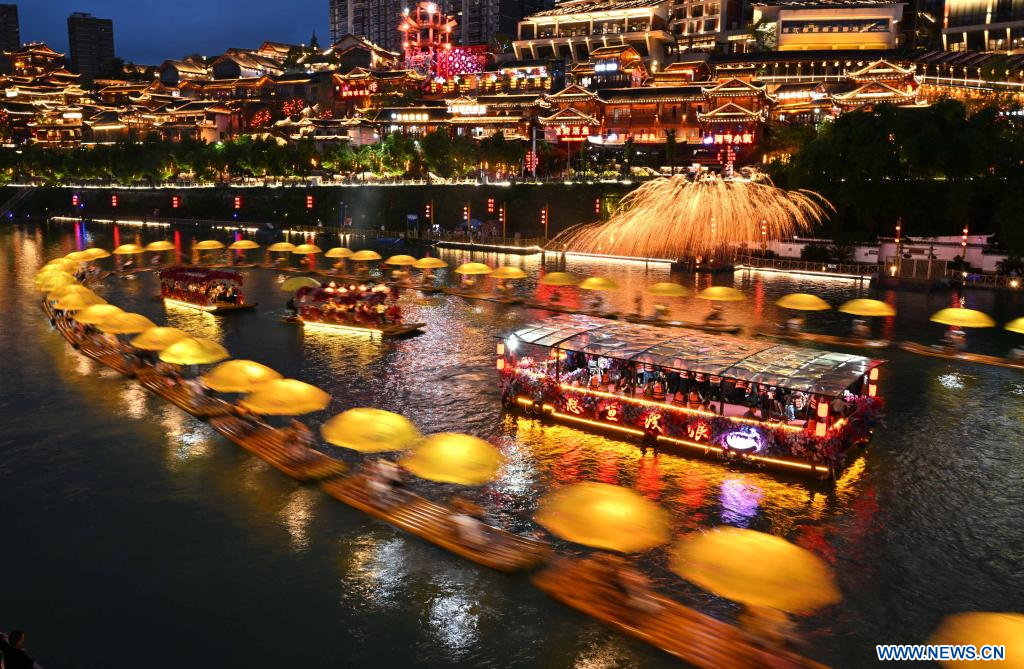 BEIJING, 3 juin (Xinhua) -- Des touristes profitent de la vue nocturne le long de la rivière Gongshui dans le district de Xuan'en, dans la province centrale du Hubei, le 1er juin 2025.
